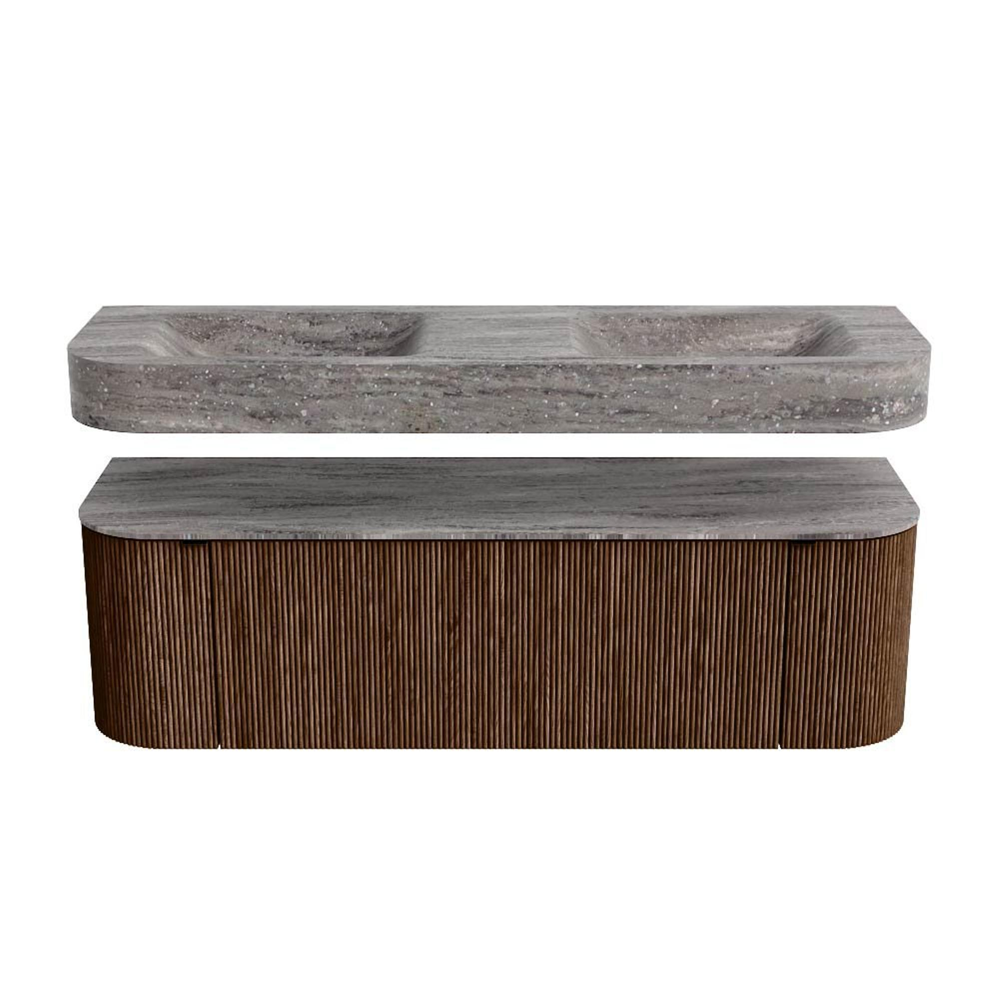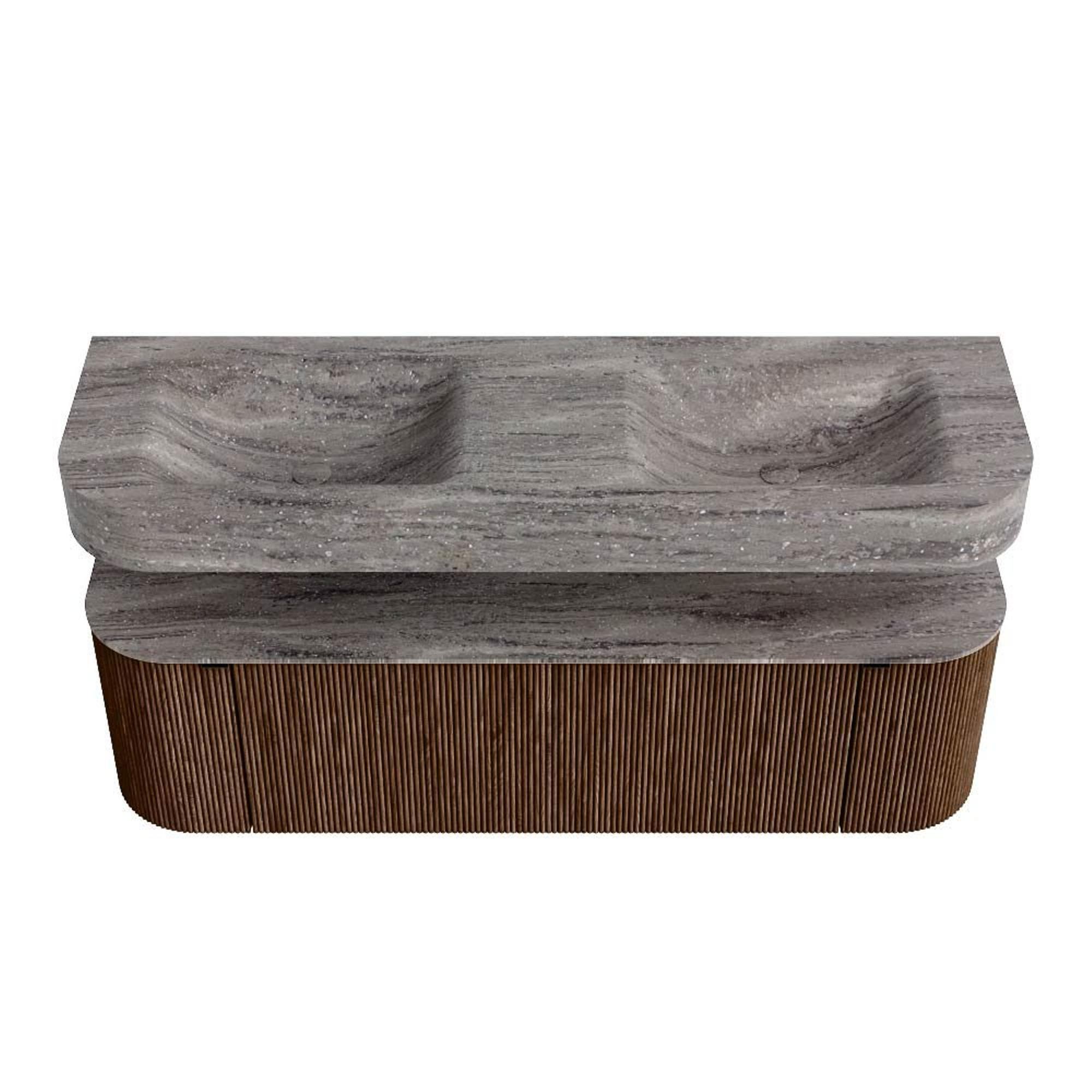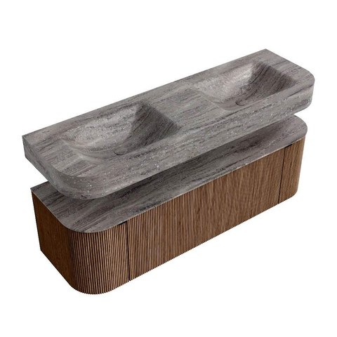 MONDIAZ THOR-DLUX 150cm badmeubel ronding links + rechts kleur Walnut met 1 lade en 2 deuren. Vrijhangende wastafel CLOUD Dubbel zonder kraangat kleur Oza.