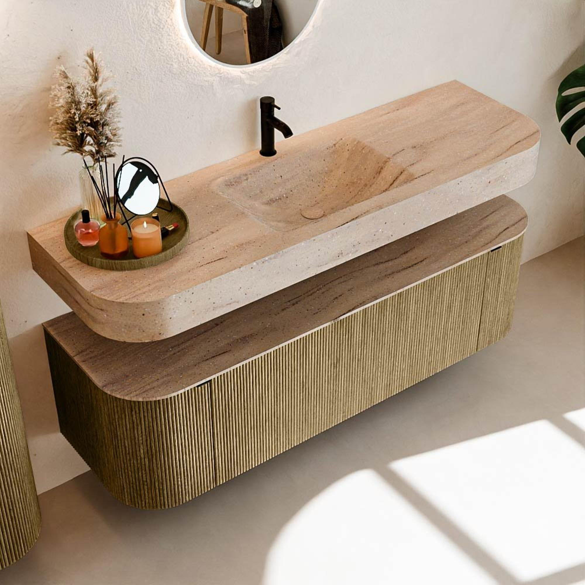 Natuurlijke materialen in warme tinten. De verticale ribbels brengen ritme en textuur in het ontwerp, terwijl het eikenhout zorgt voor een warme, ambachtelijke uitstraling. Kies uit 5 houttinten OAK, WALNUT, DUSK, SHADOW en RUBY zorgvuldig geselecteerde houtkleuren om zowel moderne als klassieke badkamers te verrijken.