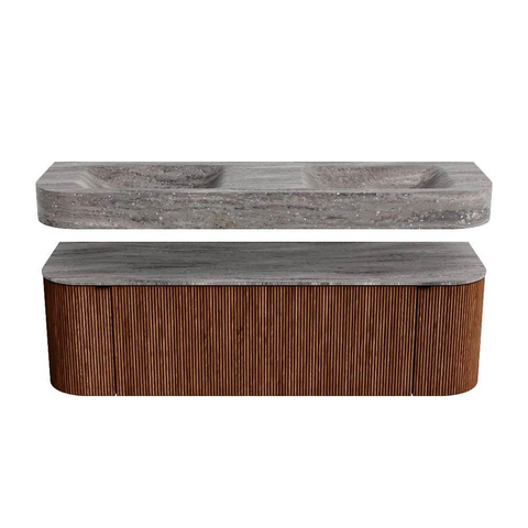 MONDIAZ THOR-DLUX 150cm badmeubel ronding links + rechts kleur Ruby met 1 lade en 2 deuren. Vrijhangende wastafel CLOUD Dubbel zonder kraangat kleur Oza.