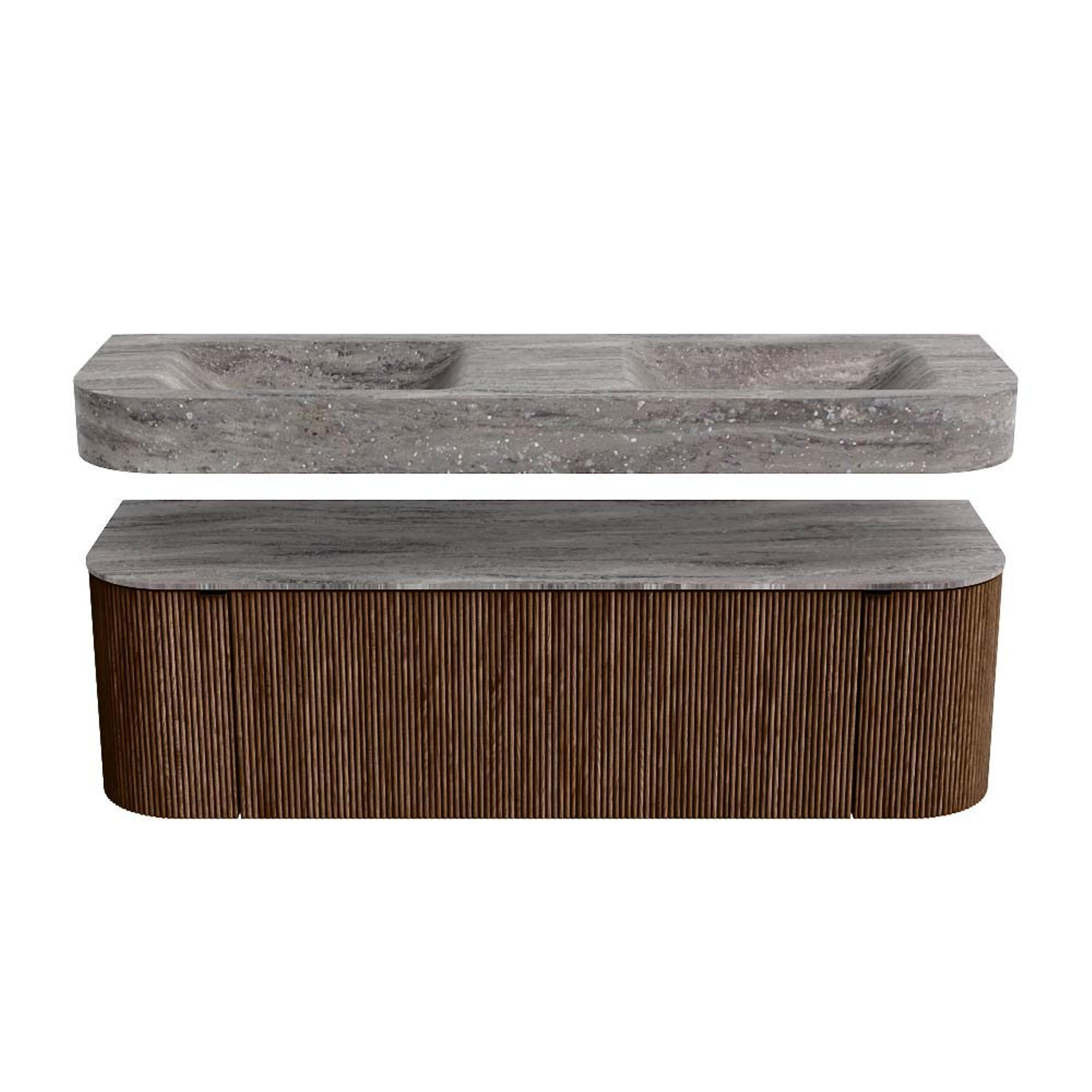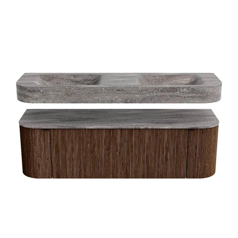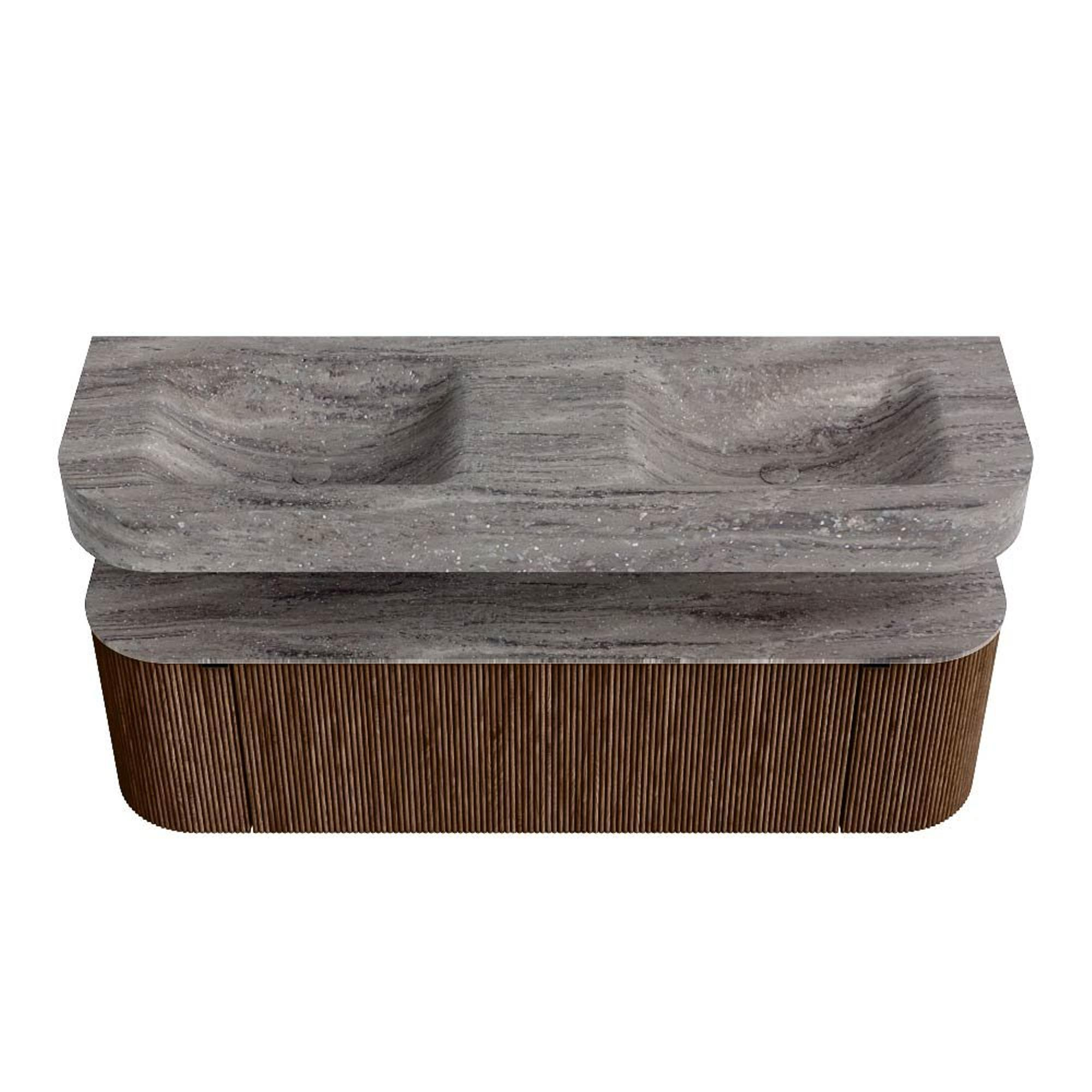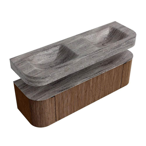 MONDIAZ THOR-DLUX 150cm badmeubel ronding links + rechts kleur Walnut met 1 lade en 2 deuren. Vrijhangende wastafel CLOUD Dubbel 2 kraangaten kleur Oza.