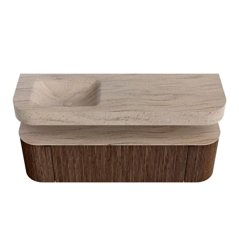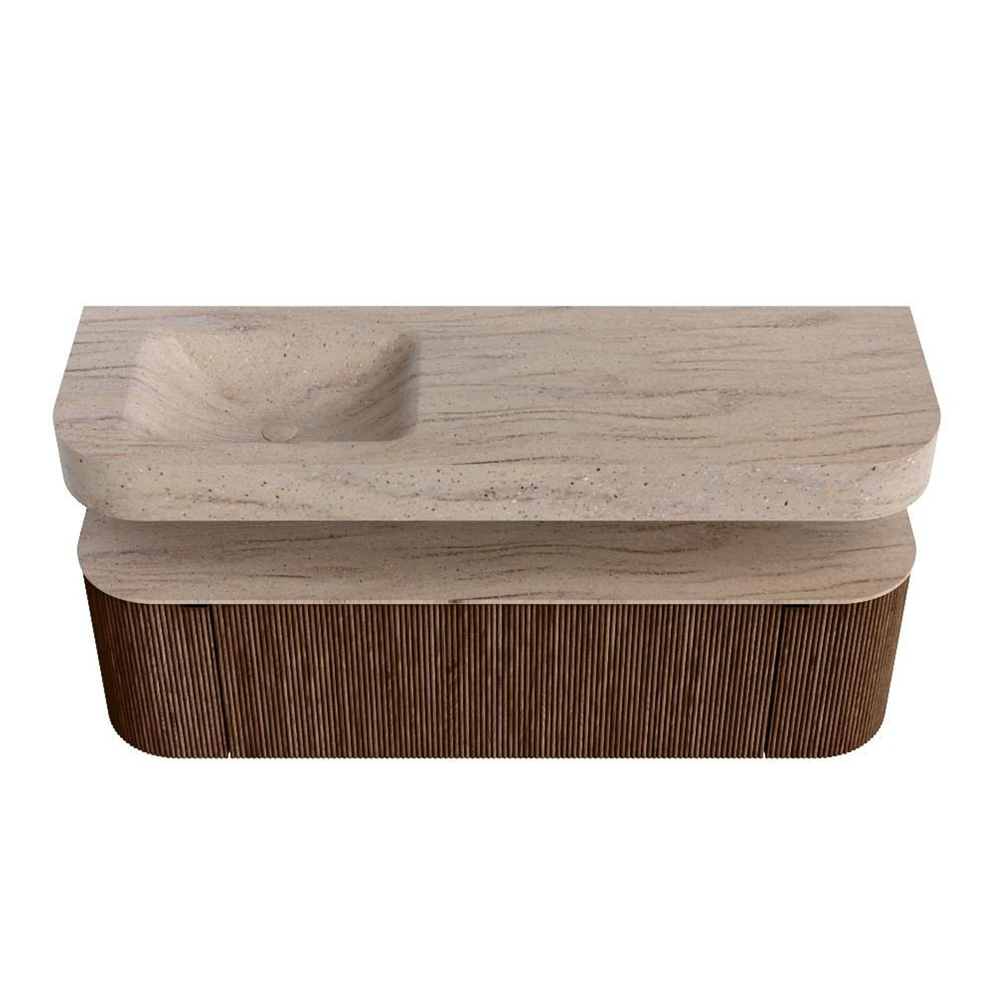 MONDIAZ THOR-DLUX 150cm badmeubel ronding links + rechts kleur Walnut met 1 lade en 2 deuren. Vrijhangende wastafel CLOUD Links 1 kraangat kleur Saba.