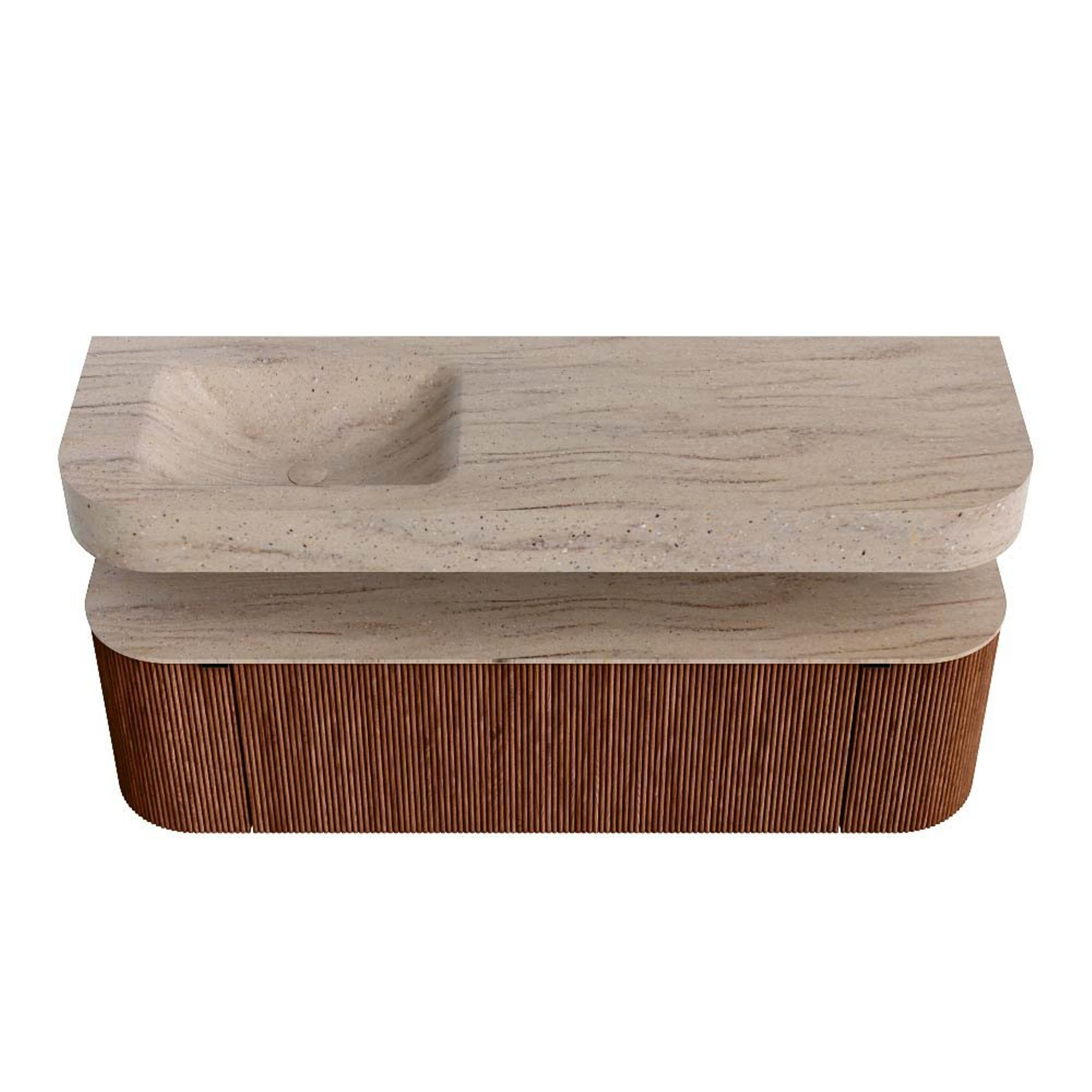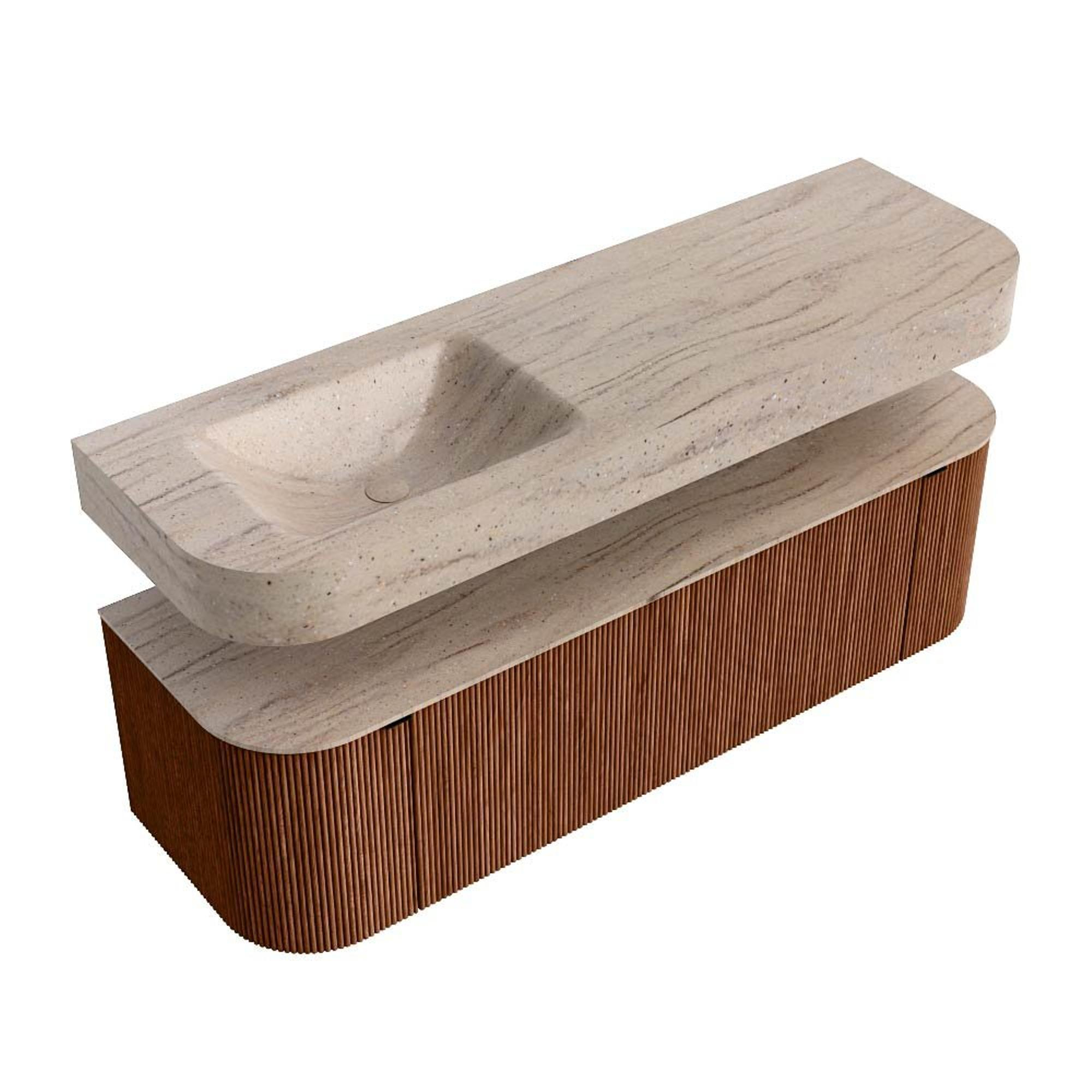 MONDIAZ THOR-DLUX 150cm badmeubel ronding links + rechts kleur Ruby met 1 lade en 2 deuren. Vrijhangende wastafel CLOUD Links zonder kraangat kleur Saba.