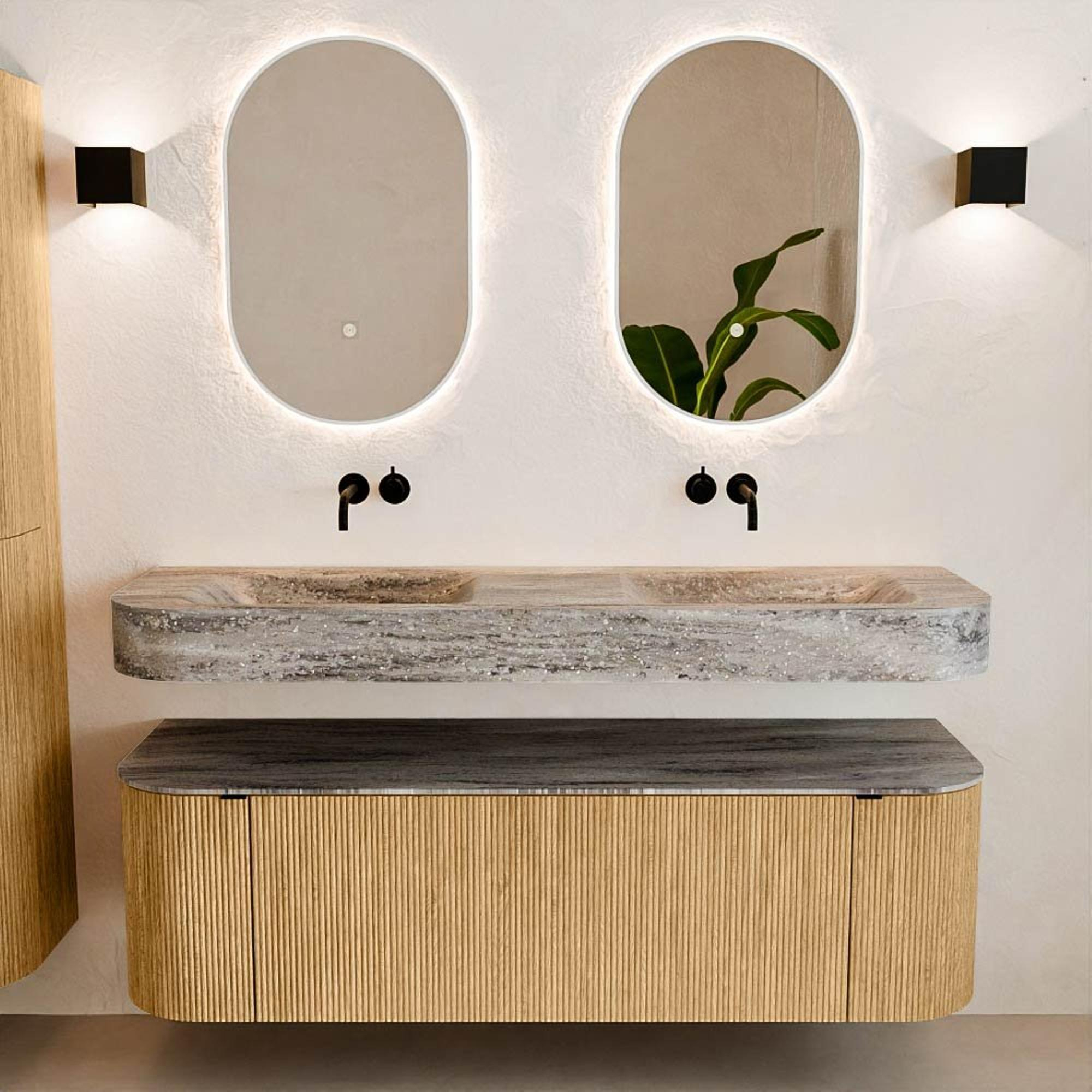 Natuurlijke materialen in warme tinten. De verticale ribbels brengen ritme en textuur in het ontwerp, terwijl het eikenhout zorgt voor een warme, ambachtelijke uitstraling. Kies uit 5 houttinten OAK, WALNUT, DUSK, SHADOW en RUBY zorgvuldig geselecteerde houtkleuren om zowel moderne als klassieke badkamers te verrijken.