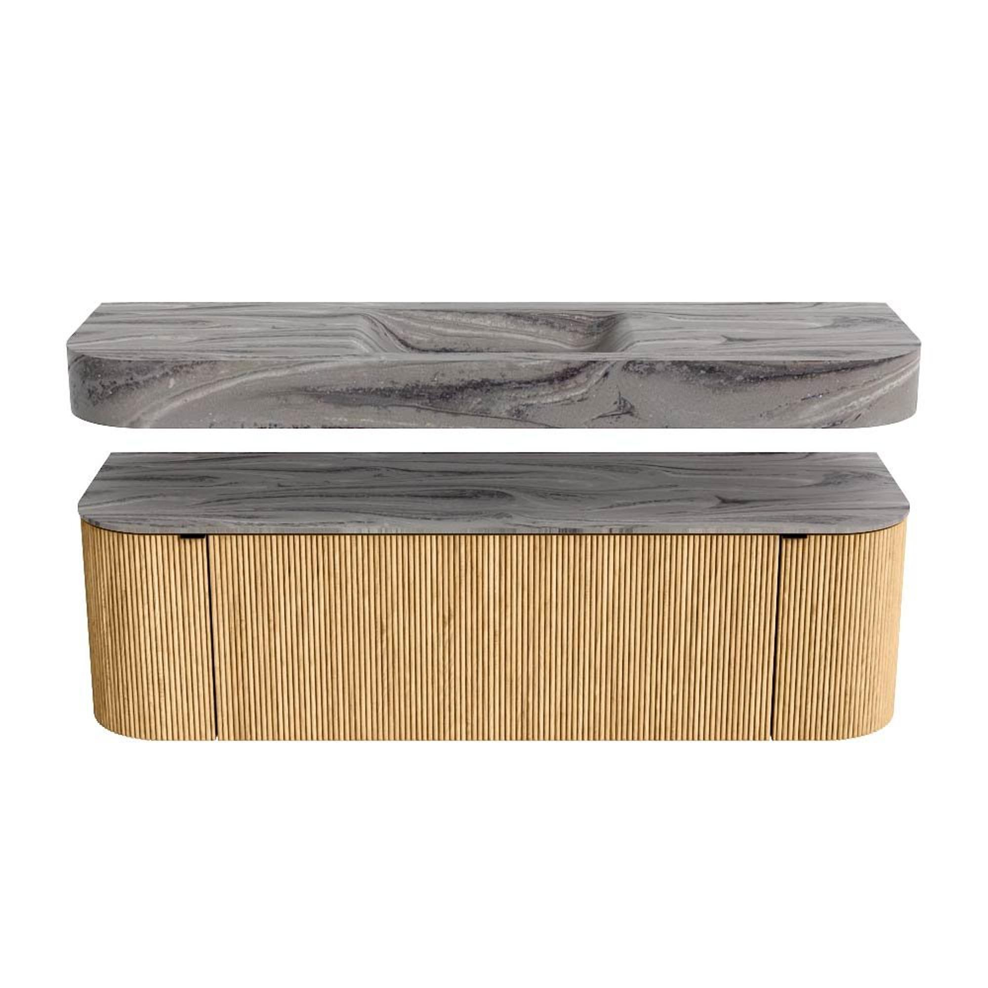 MONDIAZ THOR-DLUX 150cm badmeubel ronding links + rechts kleur Oak met 1 lade en 2 deuren. Vrijhangende wastafel CLOUD Midden zonder kraangat kleur Sombra.