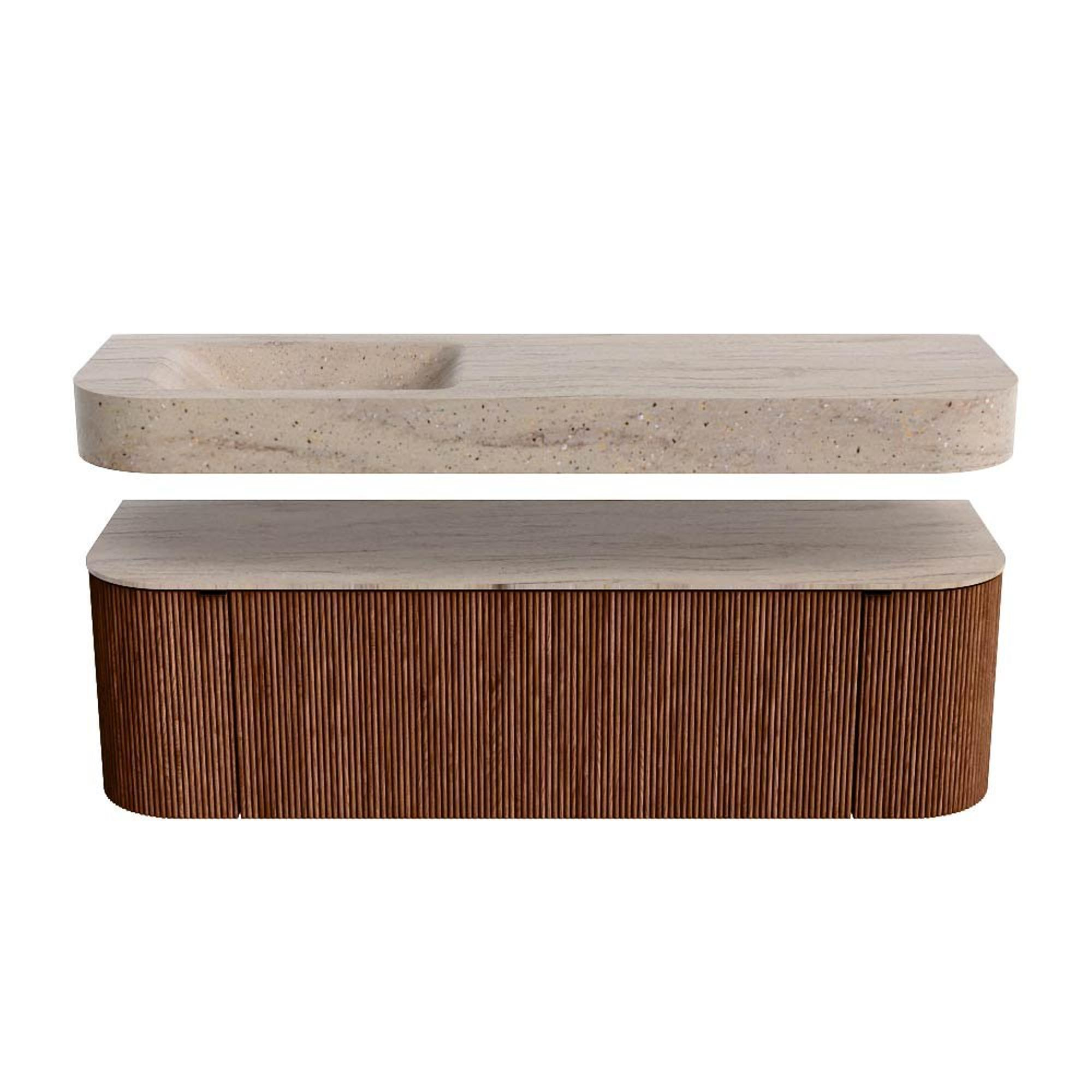Boven het meubel zweeft een bijpassende, vrij hangende wastafel met afgeronde hoeken – perfect afgestemd op de vorm van de kast. De wastafel is uitgevoerd in Solid Surface en volgt subtiel de lijnen van het onderliggende meubel, waardoor een harmonieus geheel ontstaat. Het Solid Surface topblad vormt een sterke, onderhoudsvriendelijke basis en maakt de combinatie compleet.