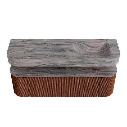 Boven het meubel zweeft een bijpassende, vrij hangende wastafel met afgeronde hoeken – perfect afgestemd op de vorm van de kast. De wastafel is uitgevoerd in Solid Surface en volgt subtiel de lijnen van het onderliggende meubel, waardoor een harmonieus geheel ontstaat. Het Solid Surface topblad vormt een sterke, onderhoudsvriendelijke basis en maakt de combinatie compleet.