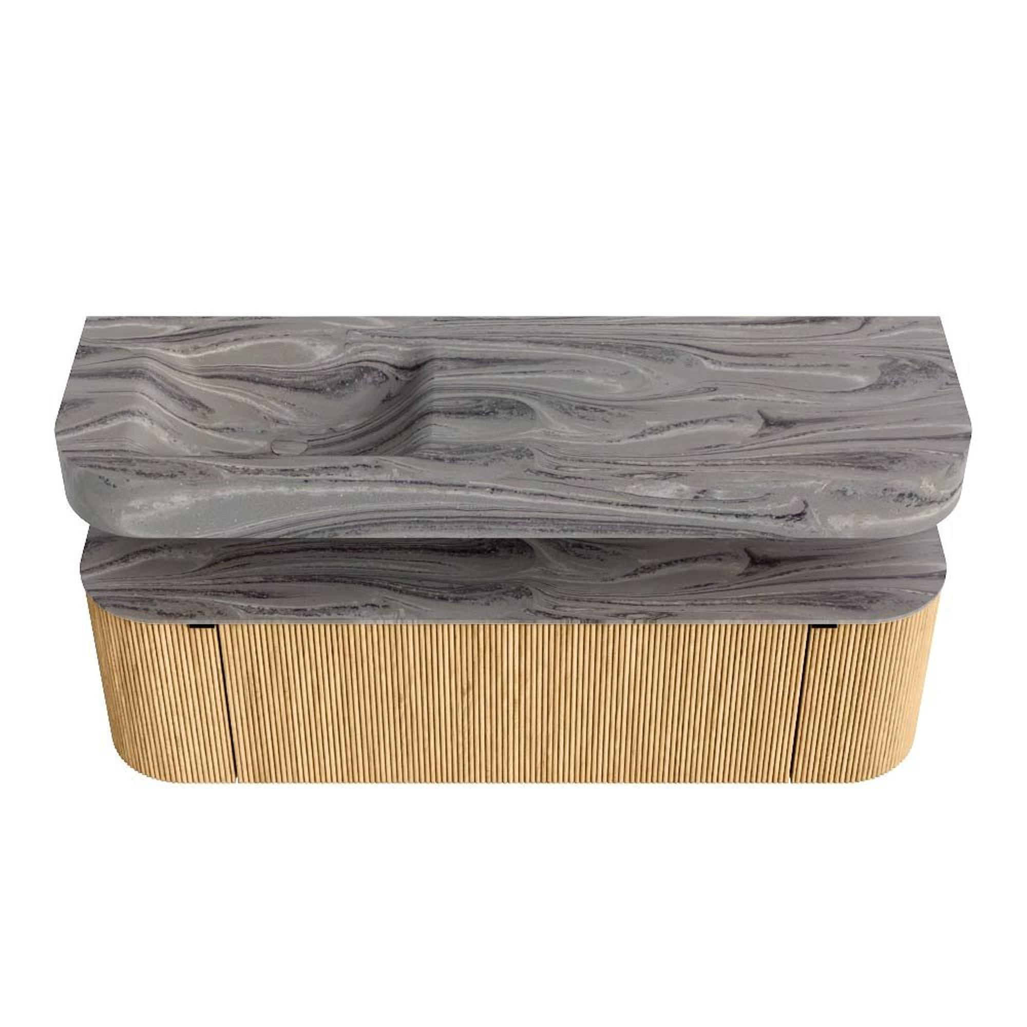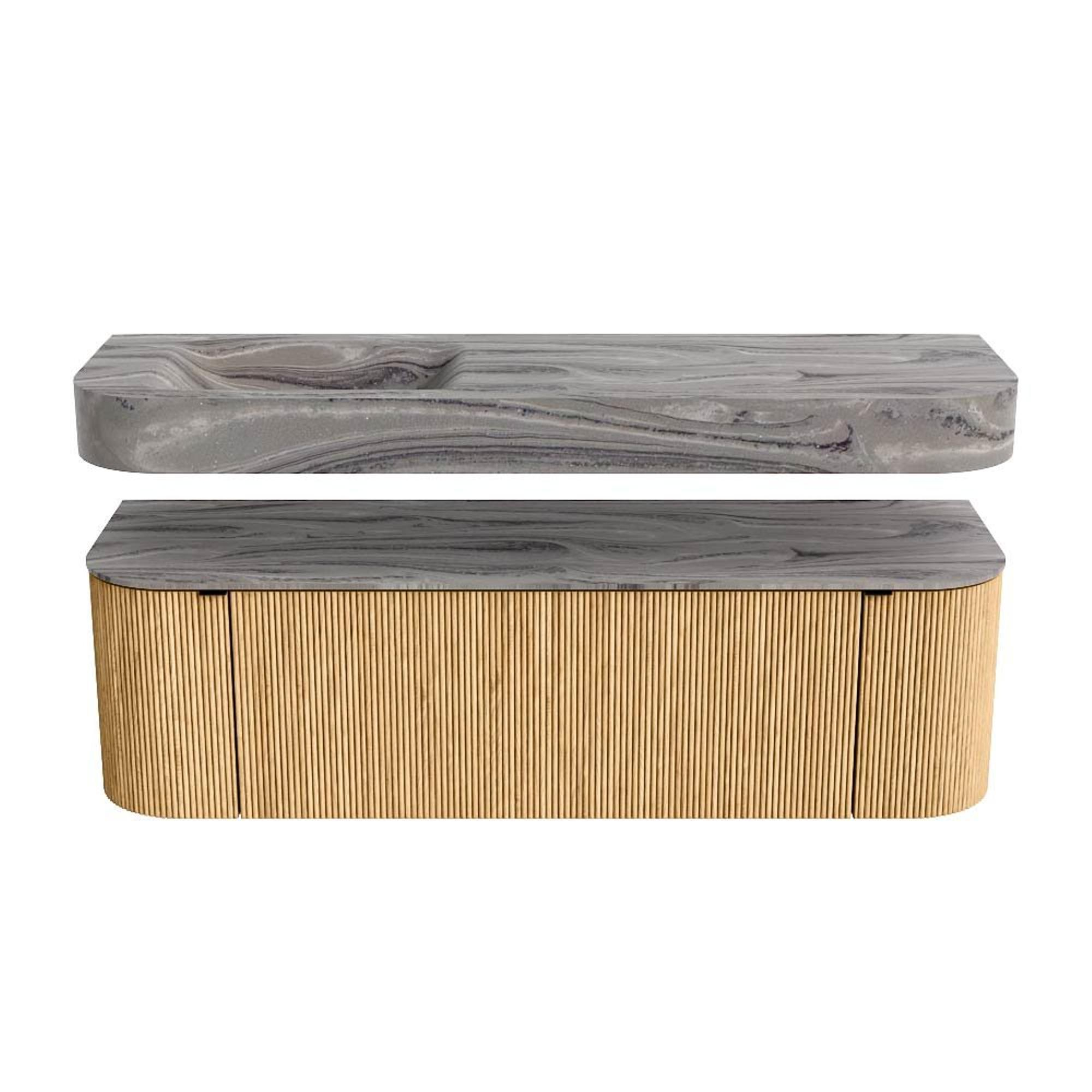 MONDIAZ THOR-DLUX 150cm badmeubel ronding links + rechts kleur Oak met 1 lade en 2 deuren. Vrijhangende wastafel CLOUD Links zonder kraangat kleur Sombra.