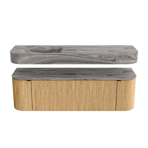 Boven het meubel zweeft een bijpassende, vrij hangende wastafel met afgeronde hoeken – perfect afgestemd op de vorm van de kast. De wastafel is uitgevoerd in Solid Surface en volgt subtiel de lijnen van het onderliggende meubel, waardoor een harmonieus geheel ontstaat. Het Solid Surface topblad vormt een sterke, onderhoudsvriendelijke basis en maakt de combinatie compleet.