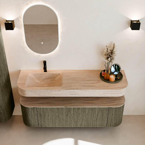 Natuurlijke materialen in warme tinten. De verticale ribbels brengen ritme en textuur in het ontwerp, terwijl het eikenhout zorgt voor een warme, ambachtelijke uitstraling. Kies uit 5 houttinten OAK, WALNUT, DUSK, SHADOW en RUBY zorgvuldig geselecteerde houtkleuren om zowel moderne als klassieke badkamers te verrijken.