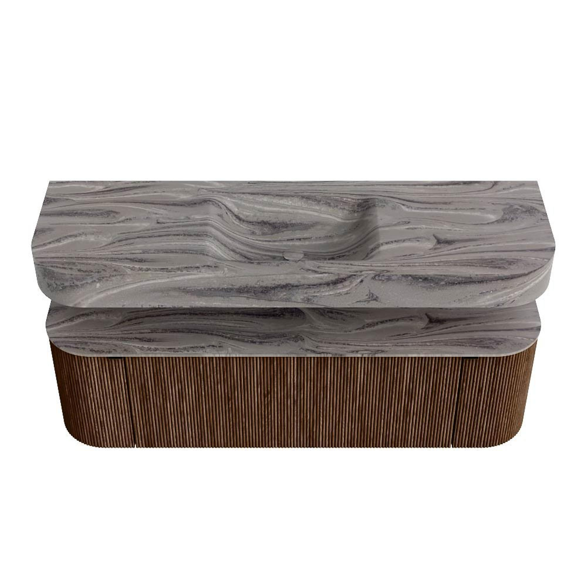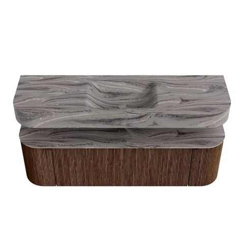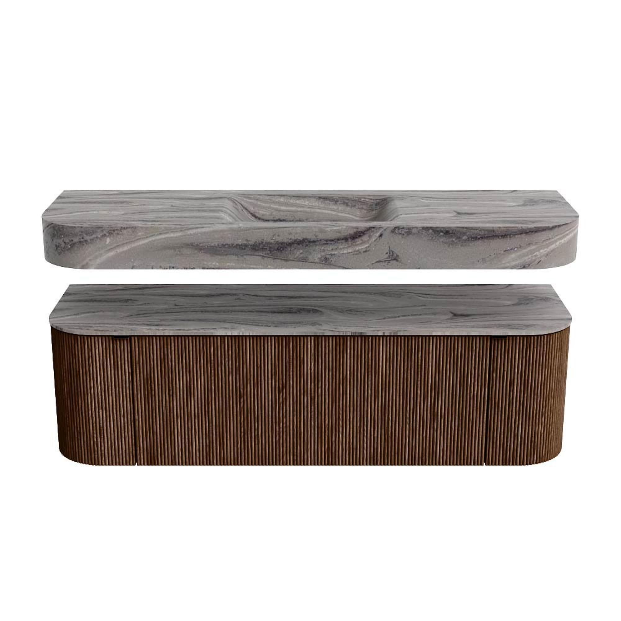 MONDIAZ THOR-DLUX 150cm badmeubel ronding links + rechts kleur Walnut met 1 lade en 2 deuren. Vrijhangende wastafel CLOUD Midden zonder kraangat kleur Sombra.
