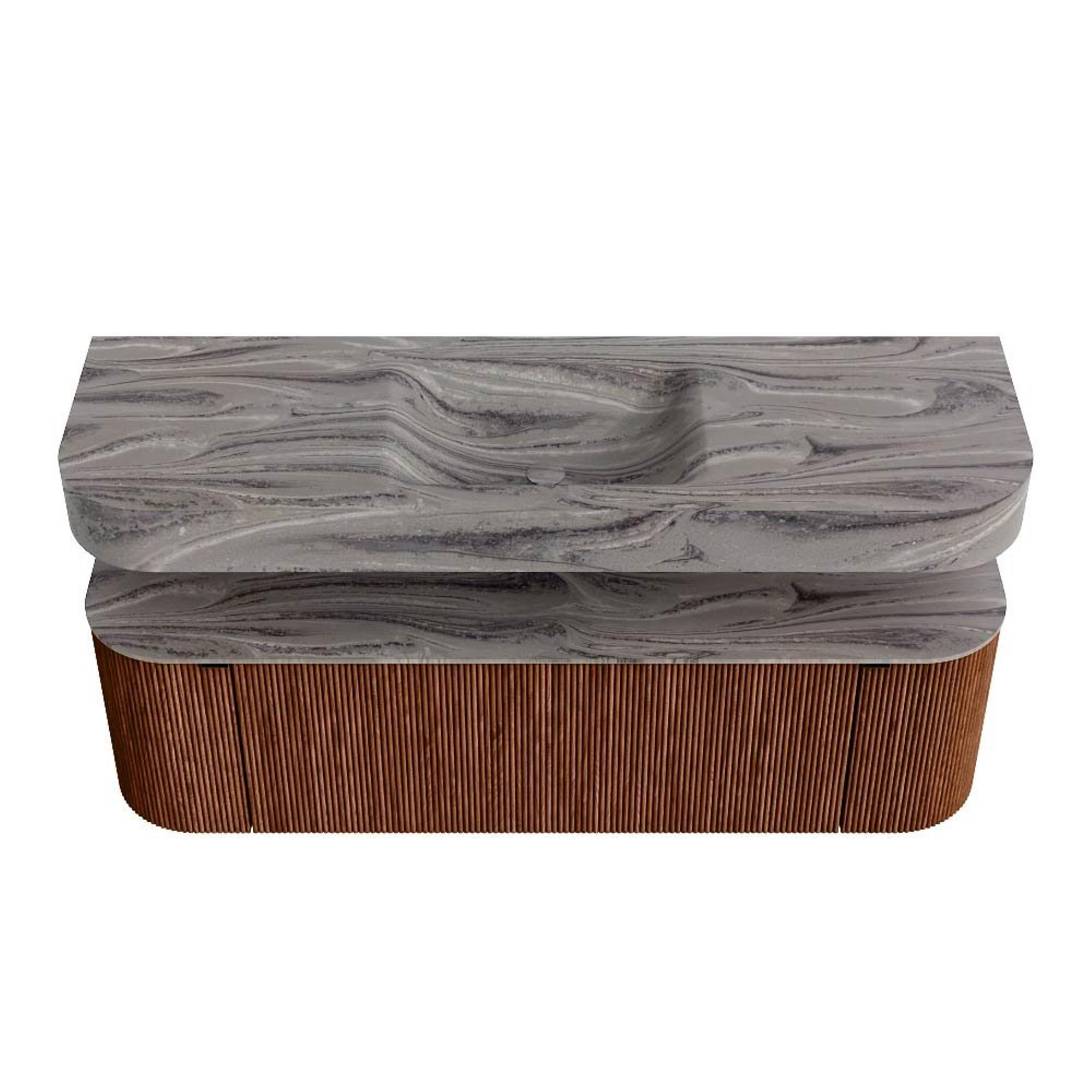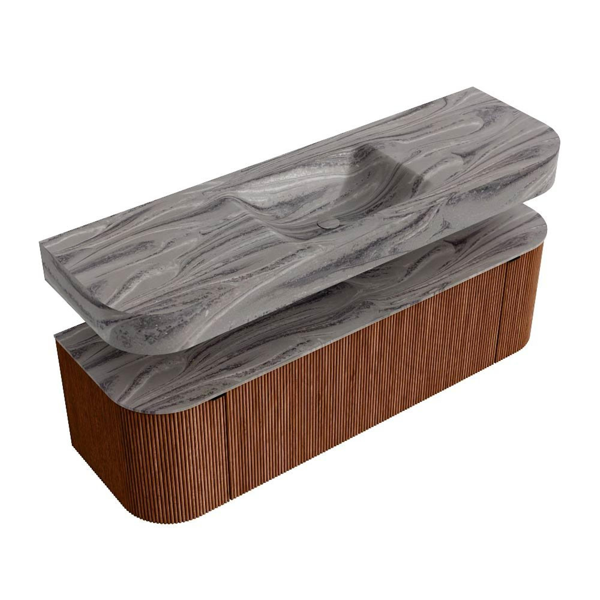 MONDIAZ THOR-DLUX 150cm badmeubel ronding links + rechts kleur Ruby met 1 lade en 2 deuren. Vrijhangende wastafel CLOUD Midden 1 kraangat kleur Sombra.