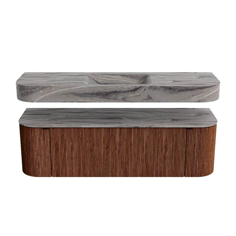 Boven het meubel zweeft een bijpassende, vrij hangende wastafel met afgeronde hoeken – perfect afgestemd op de vorm van de kast. De wastafel is uitgevoerd in Solid Surface en volgt subtiel de lijnen van het onderliggende meubel, waardoor een harmonieus geheel ontstaat. Het Solid Surface topblad vormt een sterke, onderhoudsvriendelijke basis en maakt de combinatie compleet.