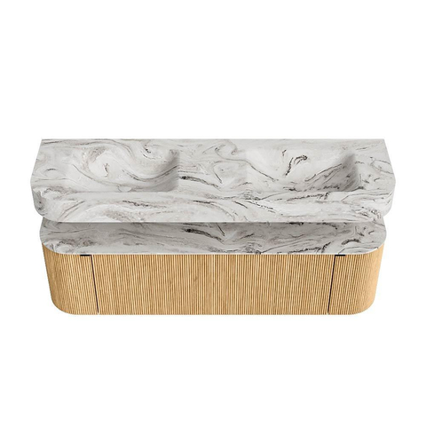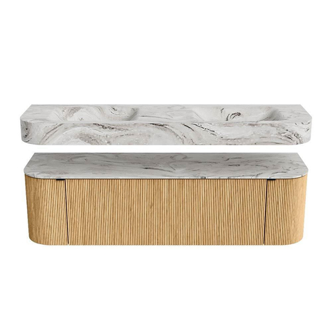 MONDIAZ THOR-DLUX 160cm badmeubel ronding links + rechts kleur Oak met 1 lade en 2 deuren. Vrijhangende wastafel CLOUD Dubbel 2 kraangaten kleur Glace.