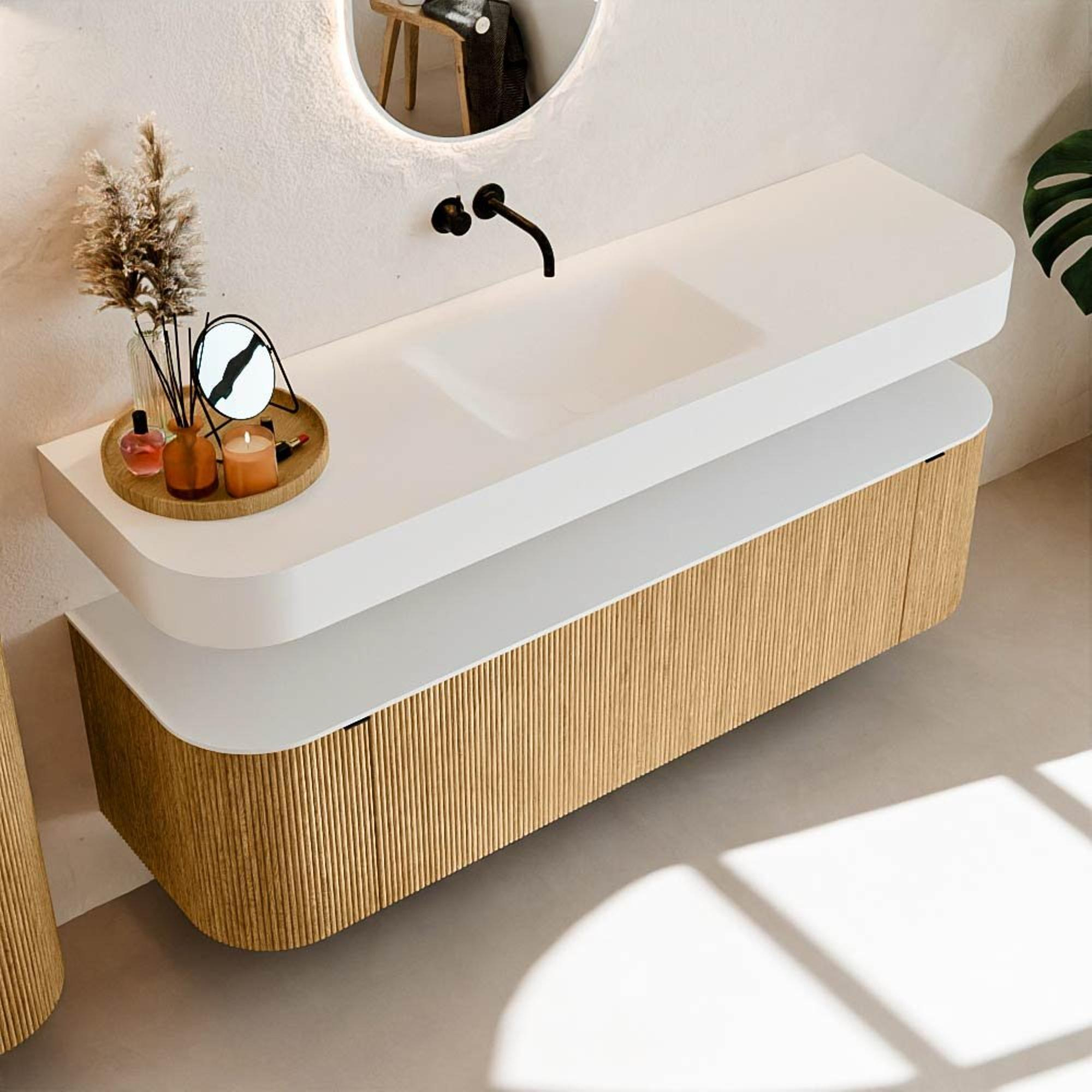 Boven het meubel zweeft een bijpassende, vrij hangende wastafel met afgeronde hoeken – perfect afgestemd op de vorm van de kast. De wastafel is uitgevoerd in Solid Surface en volgt subtiel de lijnen van het onderliggende meubel, waardoor een harmonieus geheel ontstaat. Het Solid Surface topblad vormt een sterke, onderhoudsvriendelijke basis en maakt de combinatie compleet.