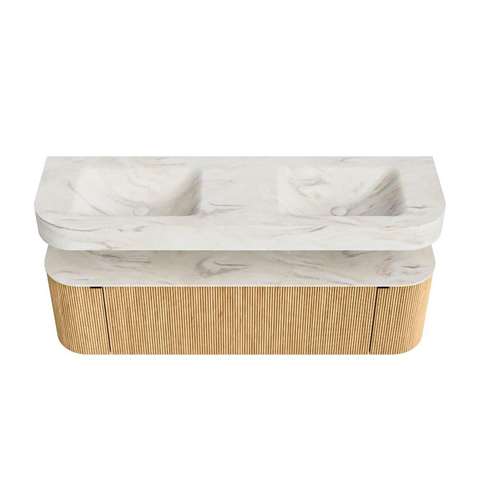 MONDIAZ THOR-DLUX 160cm badmeubel ronding links + rechts kleur Oak met 1 lade en 2 deuren. Vrijhangende wastafel CLOUD Dubbel zonder kraangat kleur Ostra.