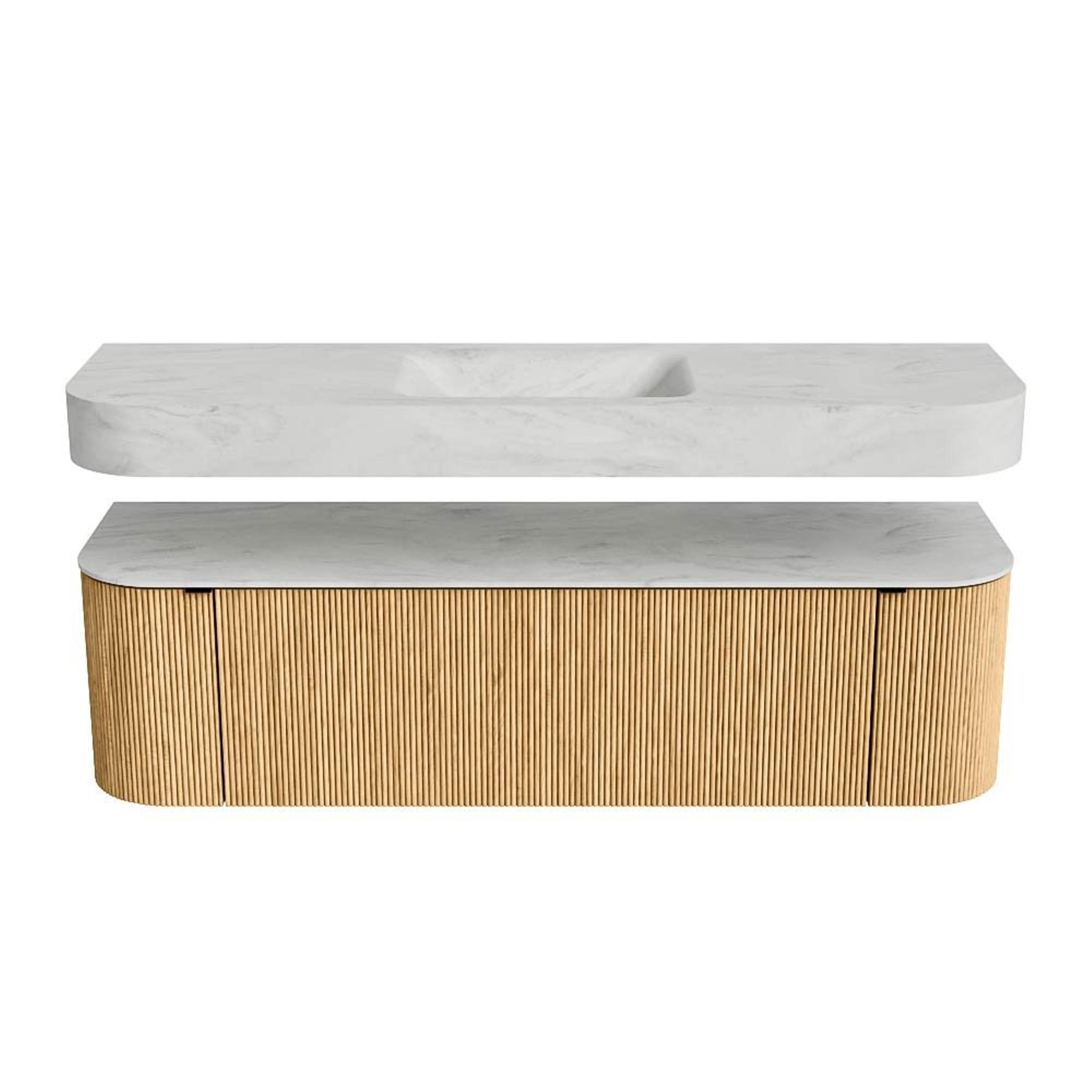 Boven het meubel zweeft een bijpassende, vrij hangende wastafel met afgeronde hoeken – perfect afgestemd op de vorm van de kast. De wastafel is uitgevoerd in Solid Surface en volgt subtiel de lijnen van het onderliggende meubel, waardoor een harmonieus geheel ontstaat. Het Solid Surface topblad vormt een sterke, onderhoudsvriendelijke basis en maakt de combinatie compleet.