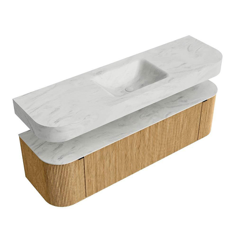MONDIAZ THOR-DLUX 160cm badmeubel ronding links + rechts kleur Oak met 1 lade en 2 deuren. Vrijhangende wastafel CLOUD Midden 1 kraangat kleur Opalo.