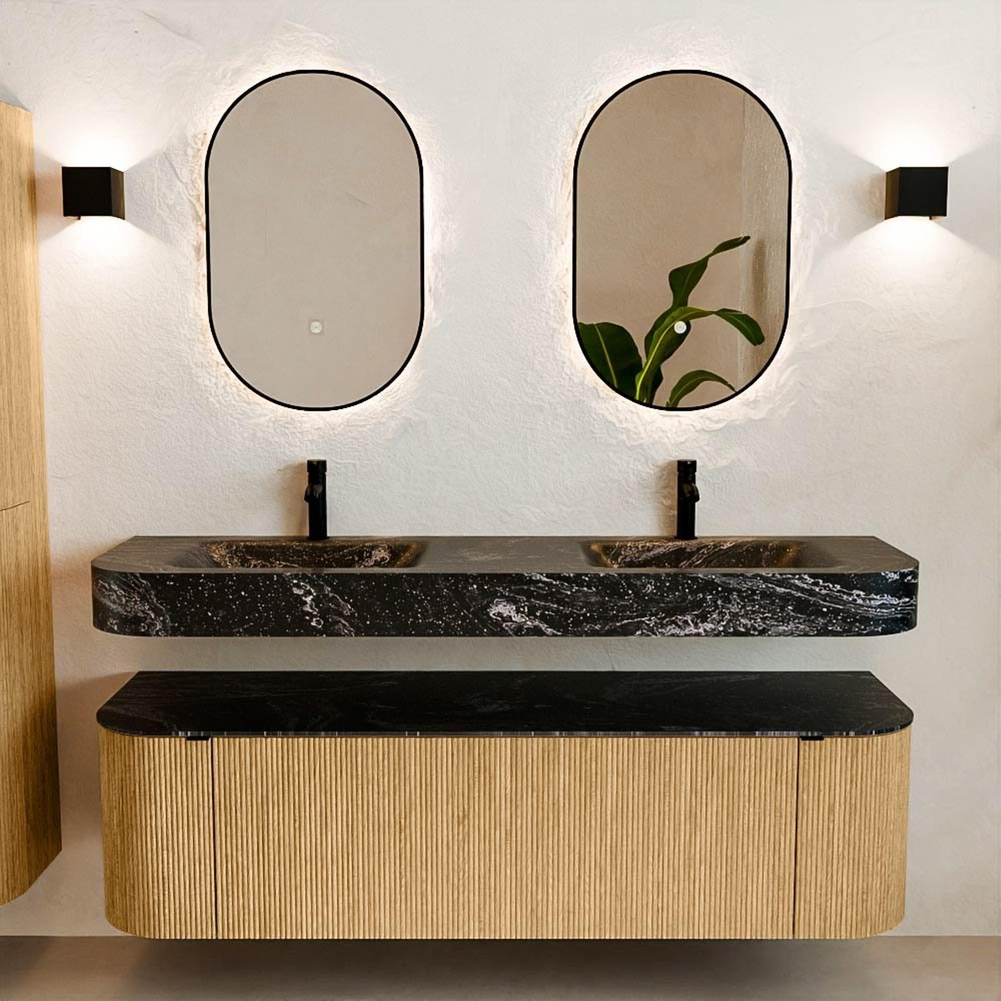 Natuurlijke materialen in warme tinten. De verticale ribbels brengen ritme en textuur in het ontwerp, terwijl het eikenhout zorgt voor een warme, ambachtelijke uitstraling. Kies uit 5 houttinten OAK, WALNUT, DUSK, SHADOW en RUBY zorgvuldig geselecteerde houtkleuren om zowel moderne als klassieke badkamers te verrijken.