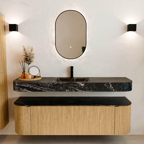Natuurlijke materialen in warme tinten. De verticale ribbels brengen ritme en textuur in het ontwerp, terwijl het eikenhout zorgt voor een warme, ambachtelijke uitstraling. Kies uit 5 houttinten OAK, WALNUT, DUSK, SHADOW en RUBY zorgvuldig geselecteerde houtkleuren om zowel moderne als klassieke badkamers te verrijken.