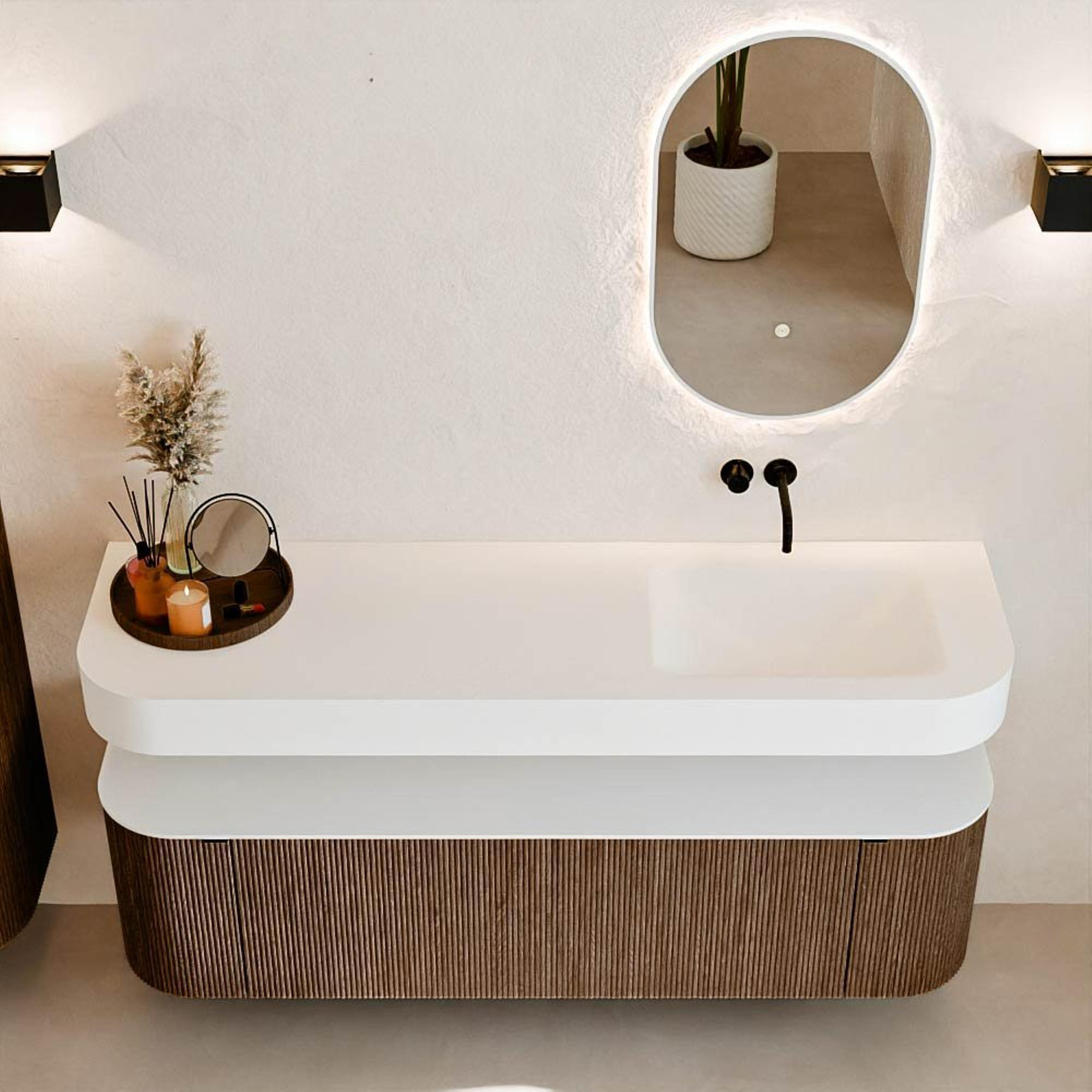 Boven het meubel zweeft een bijpassende, vrij hangende wastafel met afgeronde hoeken – perfect afgestemd op de vorm van de kast. De wastafel is uitgevoerd in Solid Surface en volgt subtiel de lijnen van het onderliggende meubel, waardoor een harmonieus geheel ontstaat. Het Solid Surface topblad vormt een sterke, onderhoudsvriendelijke basis en maakt de combinatie compleet.