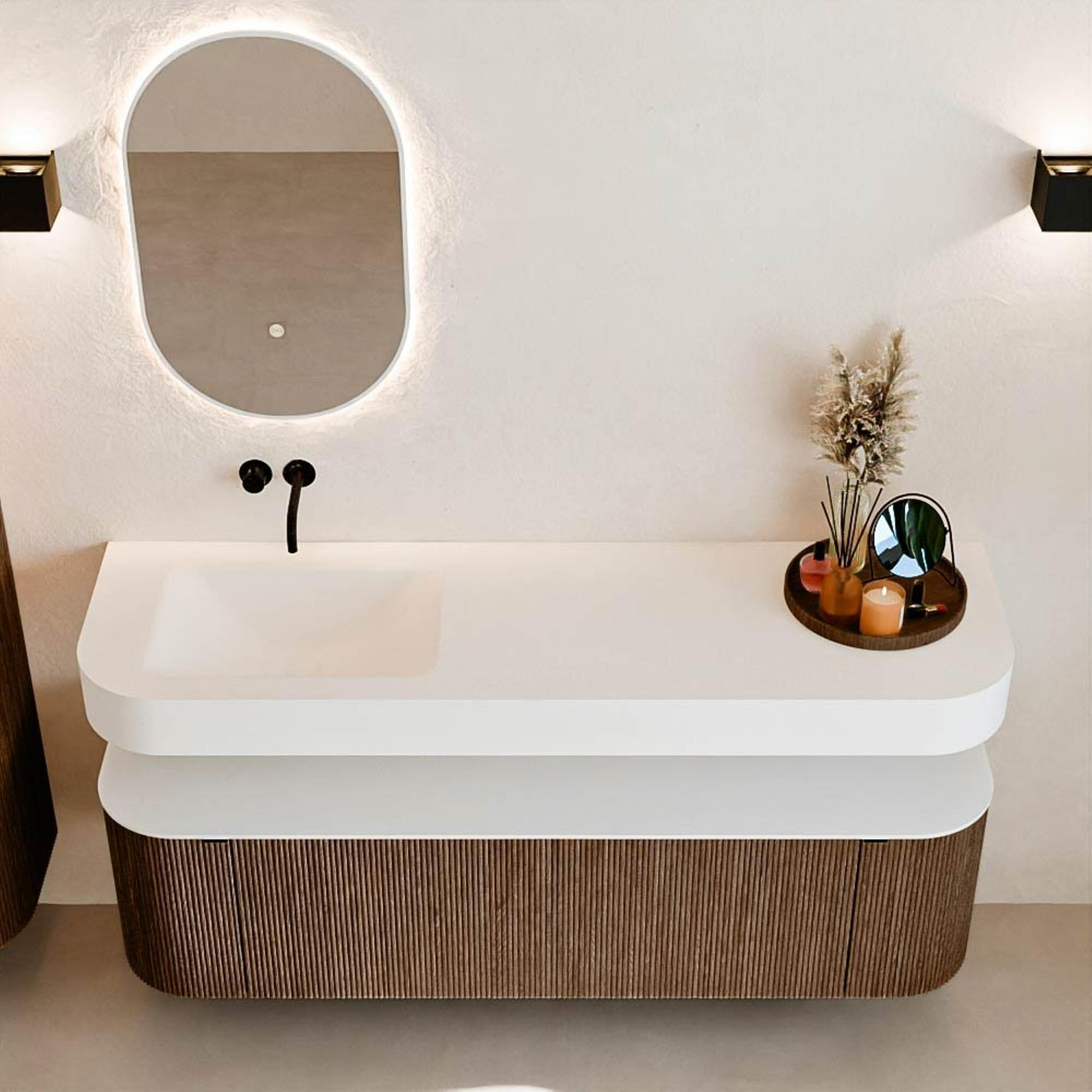 Boven het meubel zweeft een bijpassende, vrij hangende wastafel met afgeronde hoeken – perfect afgestemd op de vorm van de kast. De wastafel is uitgevoerd in Solid Surface en volgt subtiel de lijnen van het onderliggende meubel, waardoor een harmonieus geheel ontstaat. Het Solid Surface topblad vormt een sterke, onderhoudsvriendelijke basis en maakt de combinatie compleet.