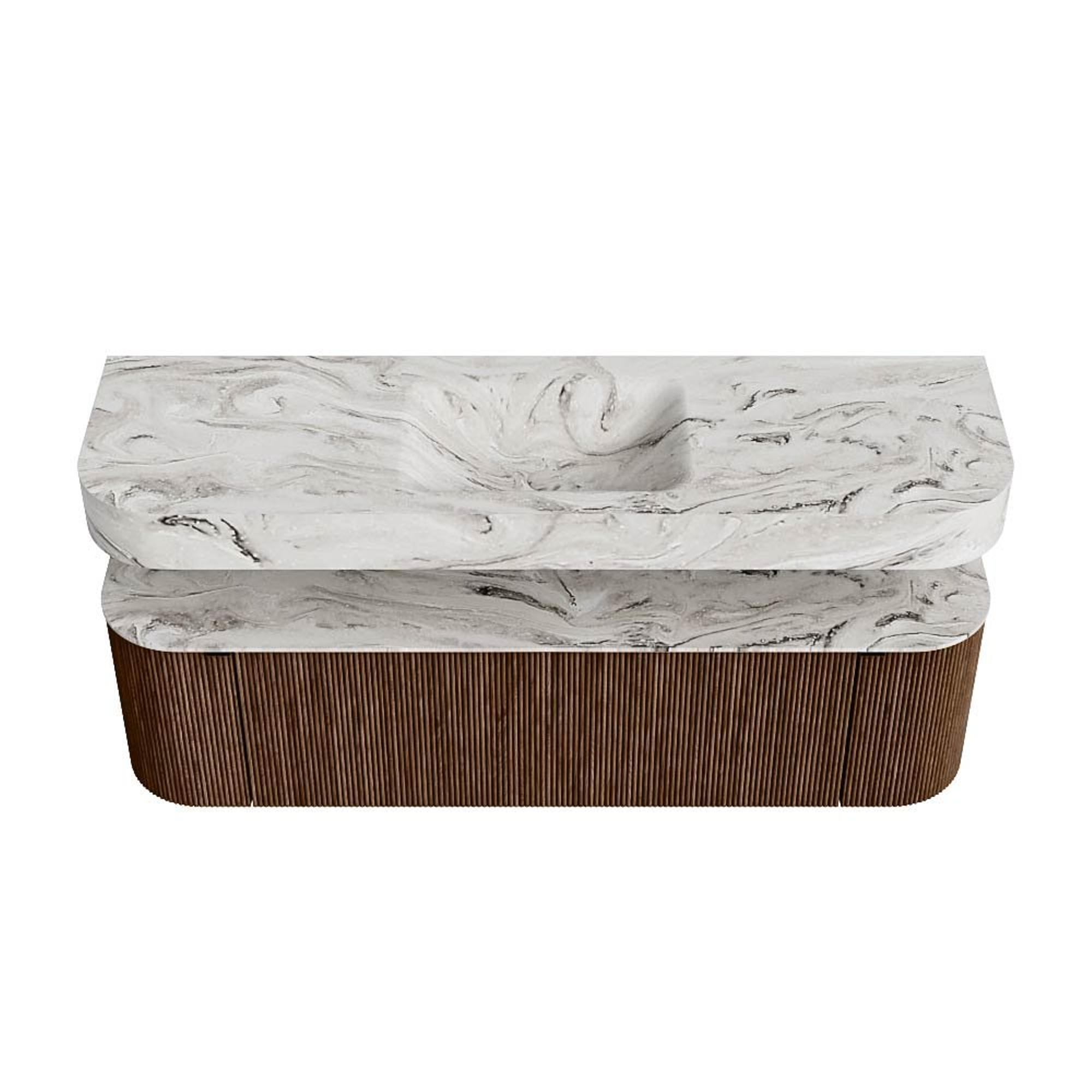 MONDIAZ THOR-DLUX 160cm badmeubel ronding links + rechts kleur Walnut met 1 lade en 2 deuren. Vrijhangende wastafel CLOUD Midden 1 kraangat kleur Glace.