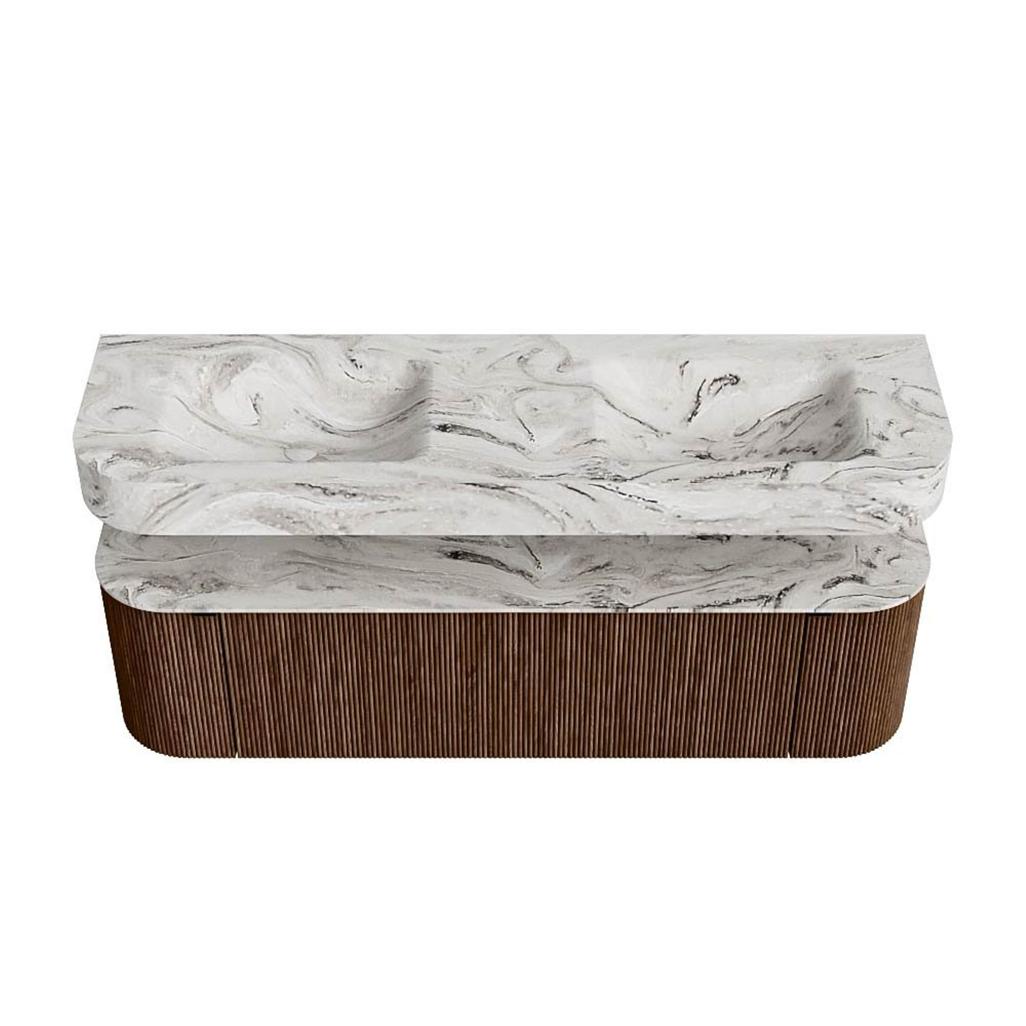 MONDIAZ THOR-DLUX 160cm badmeubel ronding links + rechts kleur Walnut met 1 lade en 2 deuren. Vrijhangende wastafel CLOUD Dubbel 2 kraangaten kleur Glace.
