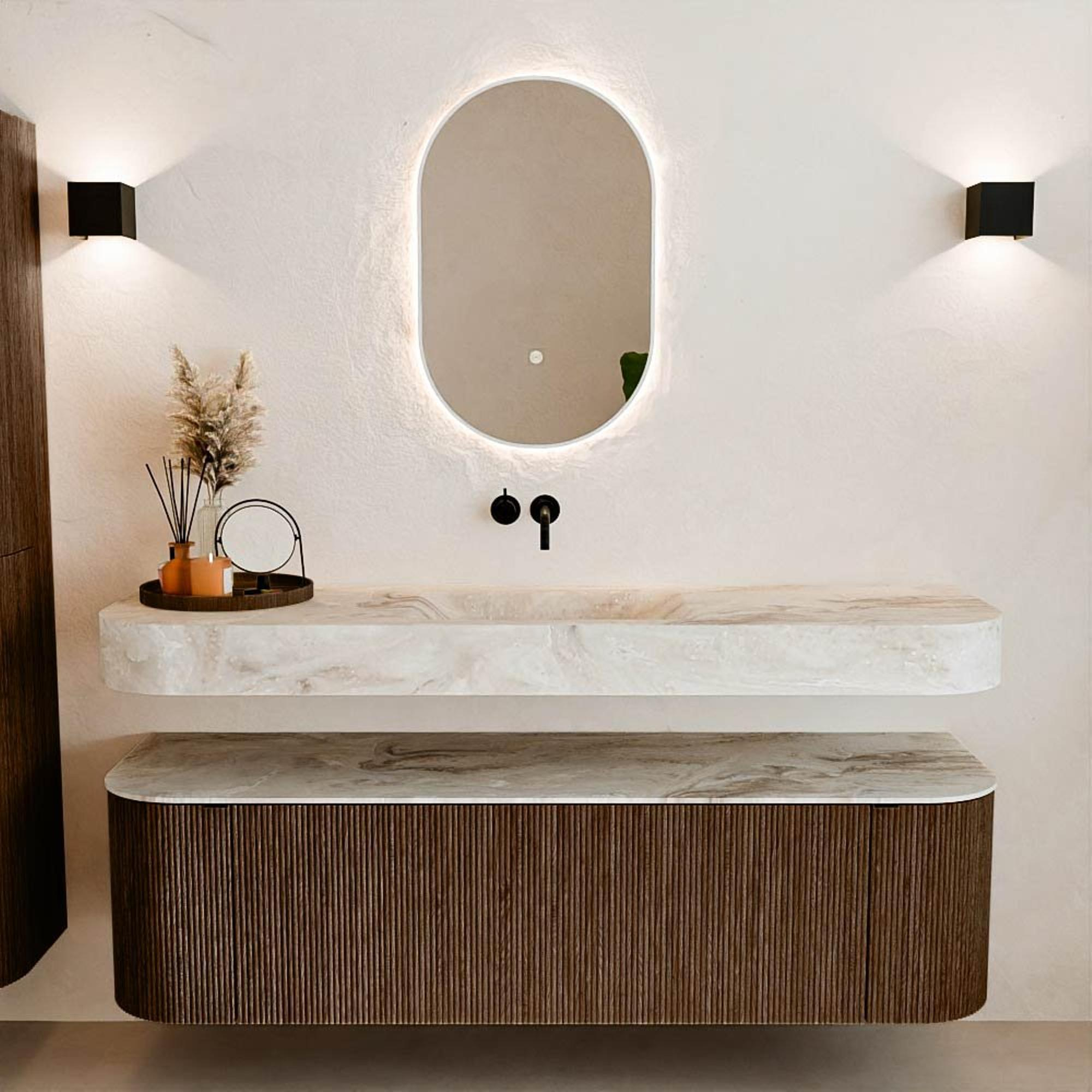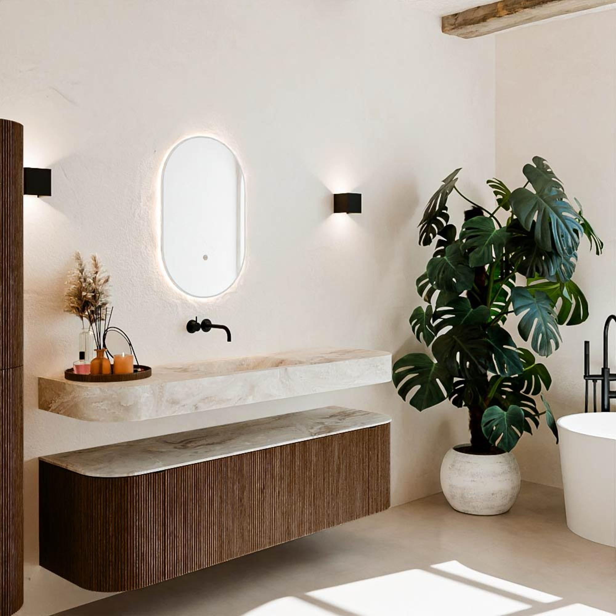 Natuurlijke materialen in warme tinten. De verticale ribbels brengen ritme en textuur in het ontwerp, terwijl het eikenhout zorgt voor een warme, ambachtelijke uitstraling. Kies uit 5 houttinten OAK, WALNUT, DUSK, SHADOW en RUBY zorgvuldig geselecteerde houtkleuren om zowel moderne als klassieke badkamers te verrijken.
