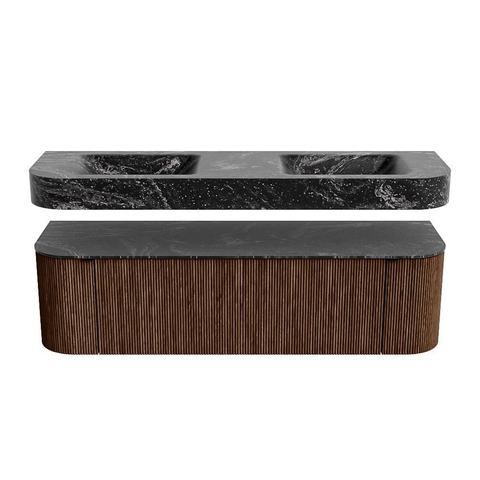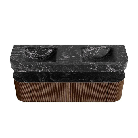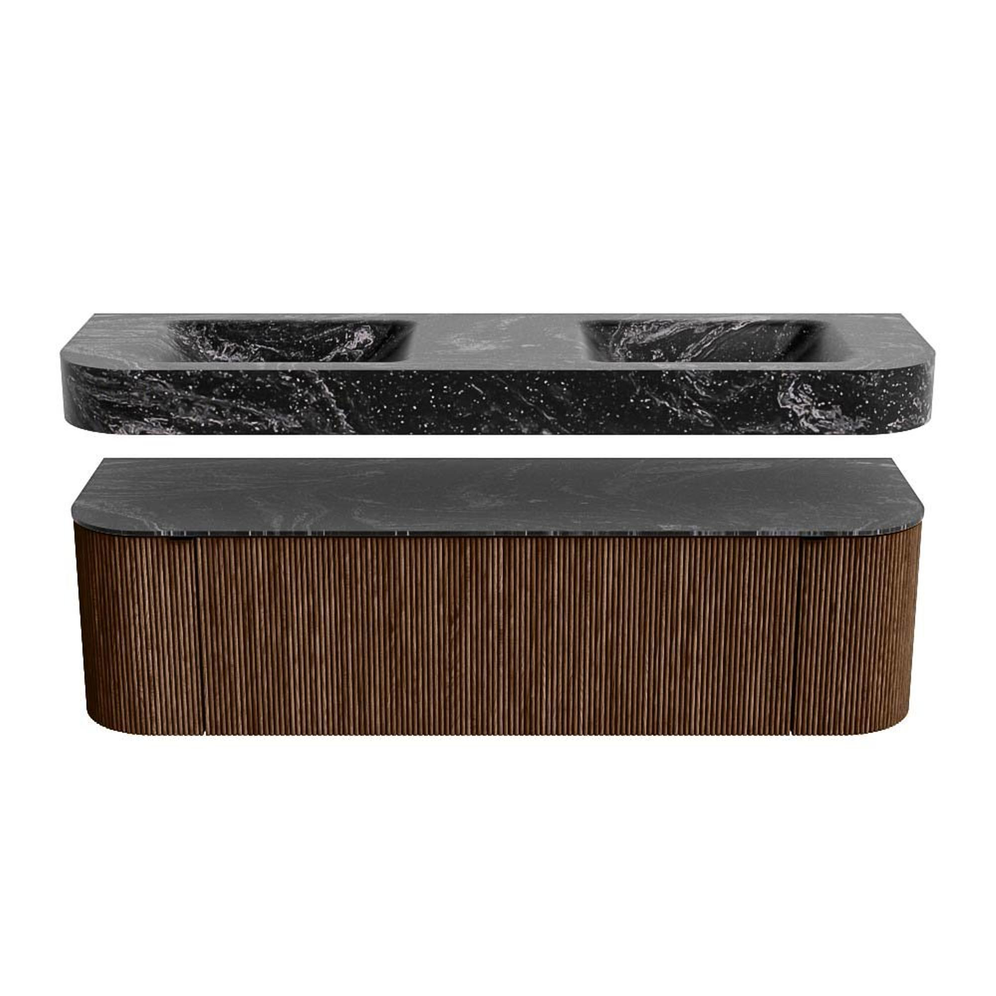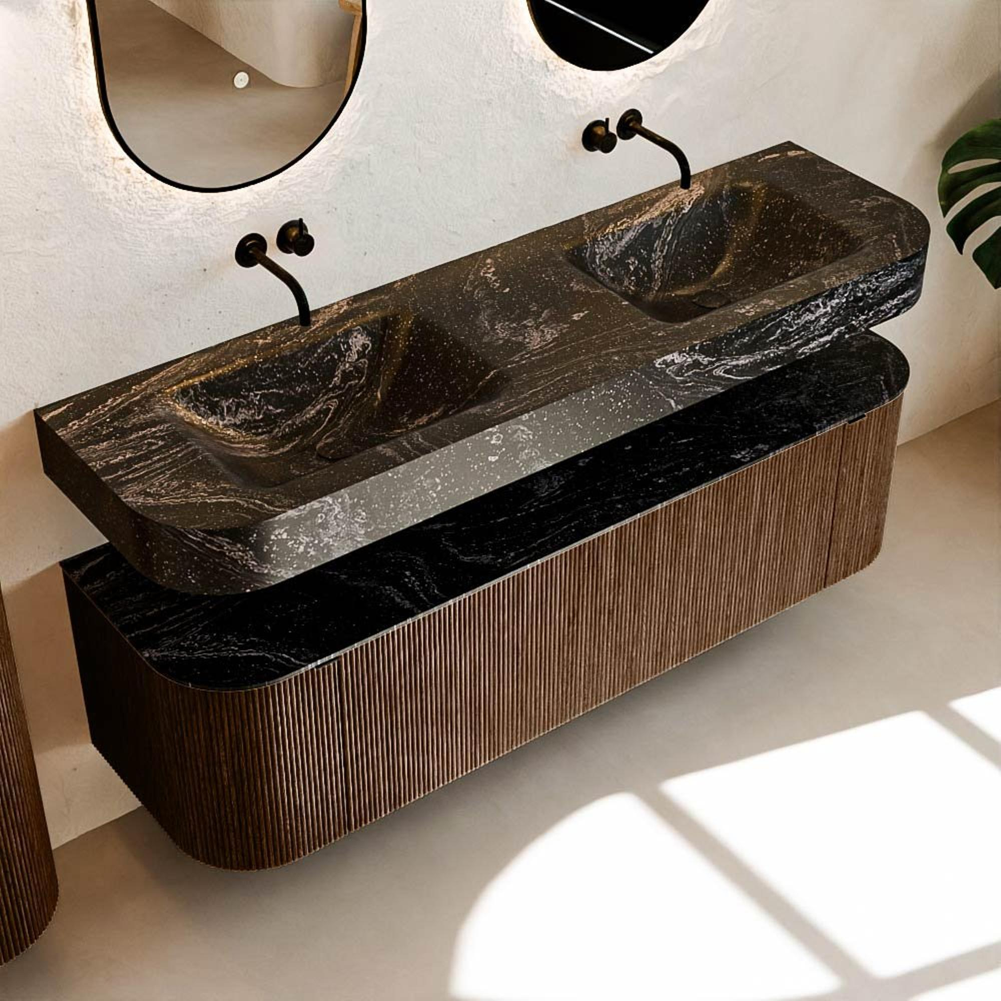 MONDIAZ THOR-DLUX 160cm badmeubel ronding links + rechts kleur Walnut met 1 lade en 2 deuren. Vrijhangende wastafel CLOUD Dubbel zonder kraangat kleur Lava.