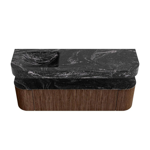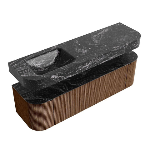 MONDIAZ THOR-DLUX 160cm badmeubel ronding links + rechts kleur Walnut met 1 lade en 2 deuren. Vrijhangende wastafel CLOUD Links zonder kraangat kleur Lava.