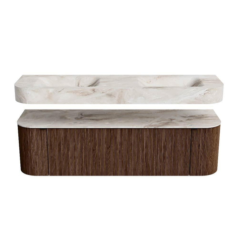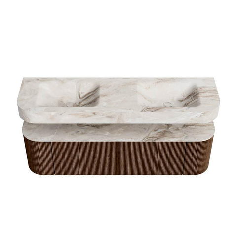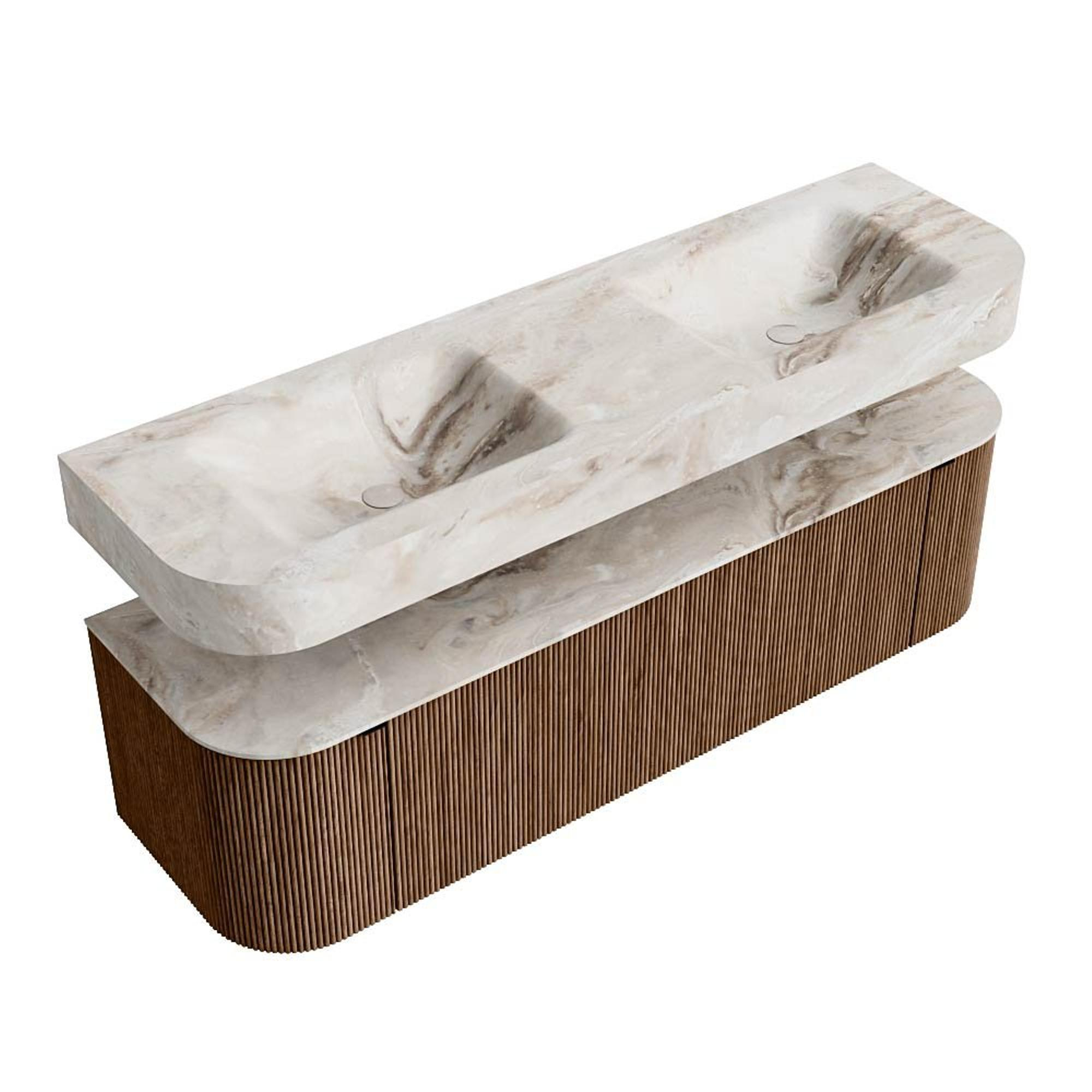 MONDIAZ THOR-DLUX 160cm badmeubel ronding links + rechts kleur Walnut met 1 lade en 2 deuren. Vrijhangende wastafel CLOUD Dubbel 2 kraangaten kleur Frappe.