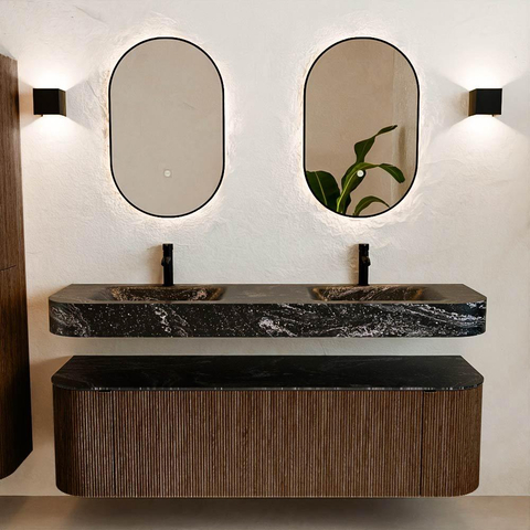 MONDIAZ THOR-DLUX 160cm badmeubel ronding links + rechts kleur Walnut met 1 lade en 2 deuren. Vrijhangende wastafel CLOUD Dubbel 2 kraangaten kleur Lava.