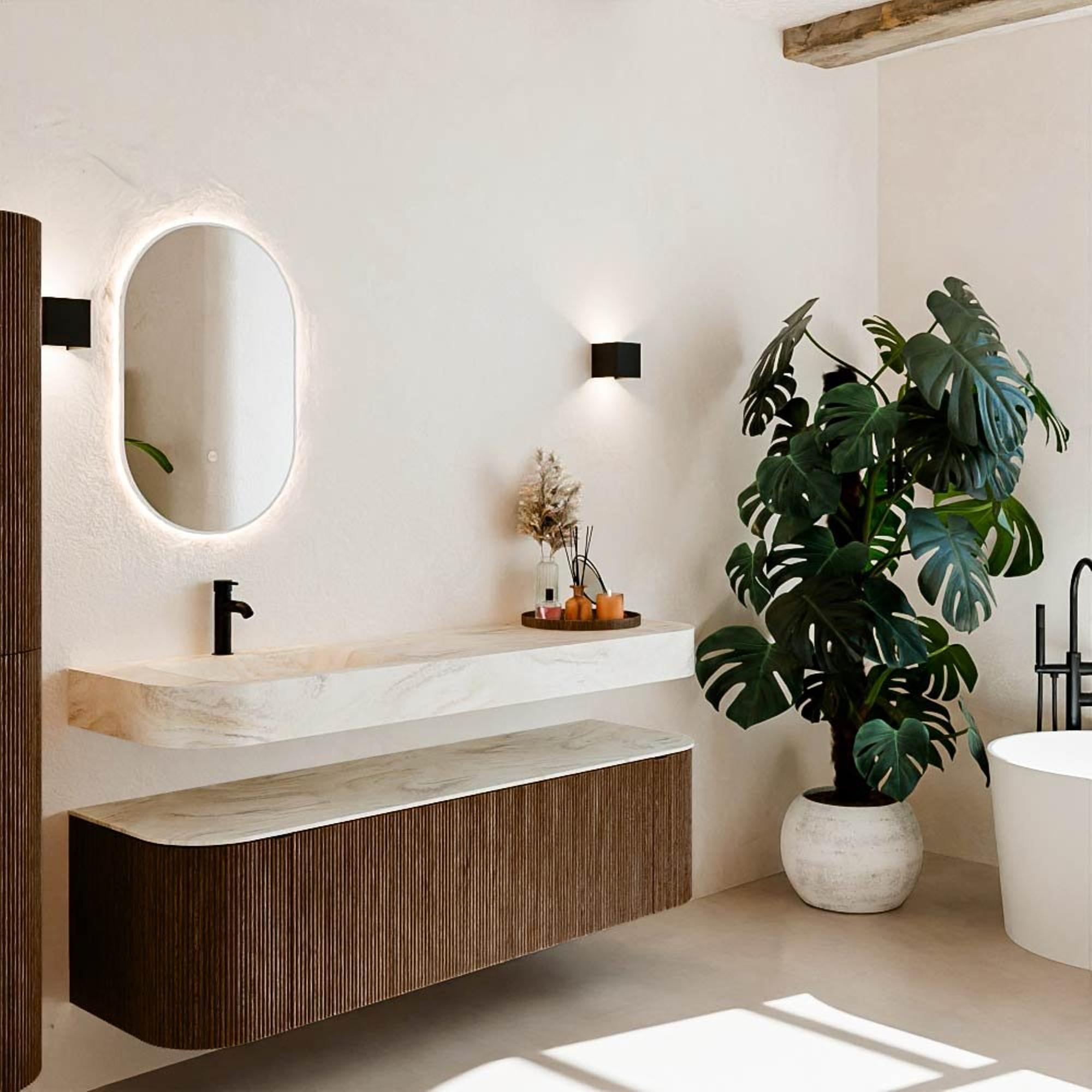 Natuurlijke materialen in warme tinten. De verticale ribbels brengen ritme en textuur in het ontwerp, terwijl het eikenhout zorgt voor een warme, ambachtelijke uitstraling. Kies uit 5 houttinten OAK, WALNUT, DUSK, SHADOW en RUBY zorgvuldig geselecteerde houtkleuren om zowel moderne als klassieke badkamers te verrijken.