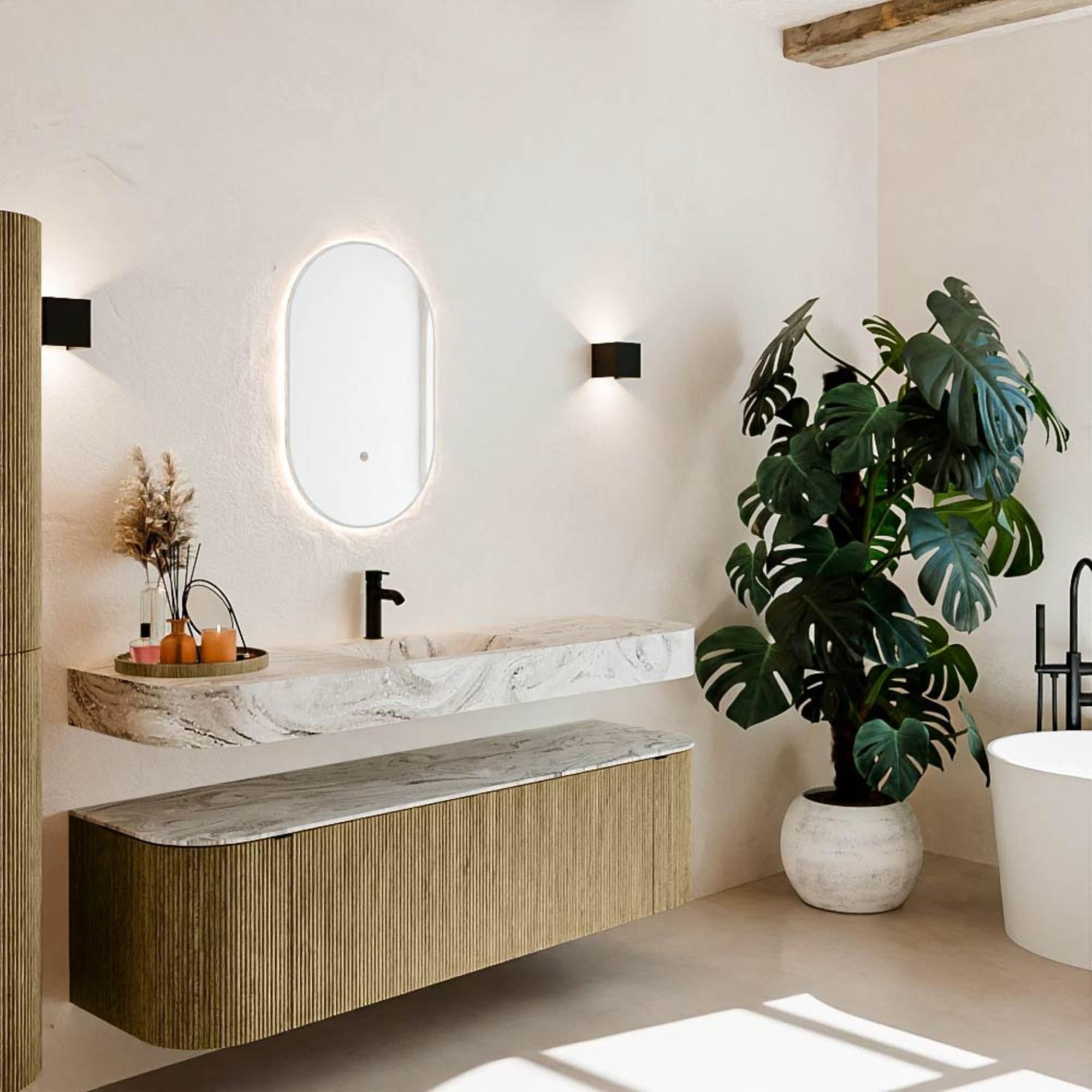 Natuurlijke materialen in warme tinten. De verticale ribbels brengen ritme en textuur in het ontwerp, terwijl het eikenhout zorgt voor een warme, ambachtelijke uitstraling. Kies uit 5 houttinten OAK, WALNUT, DUSK, SHADOW en RUBY zorgvuldig geselecteerde houtkleuren om zowel moderne als klassieke badkamers te verrijken.