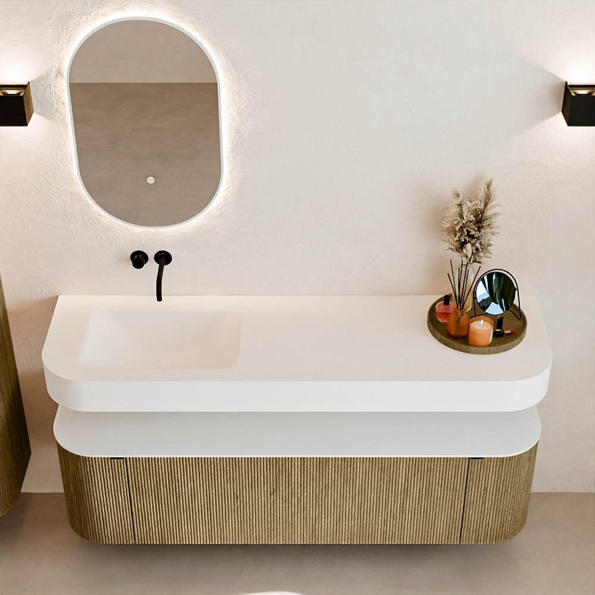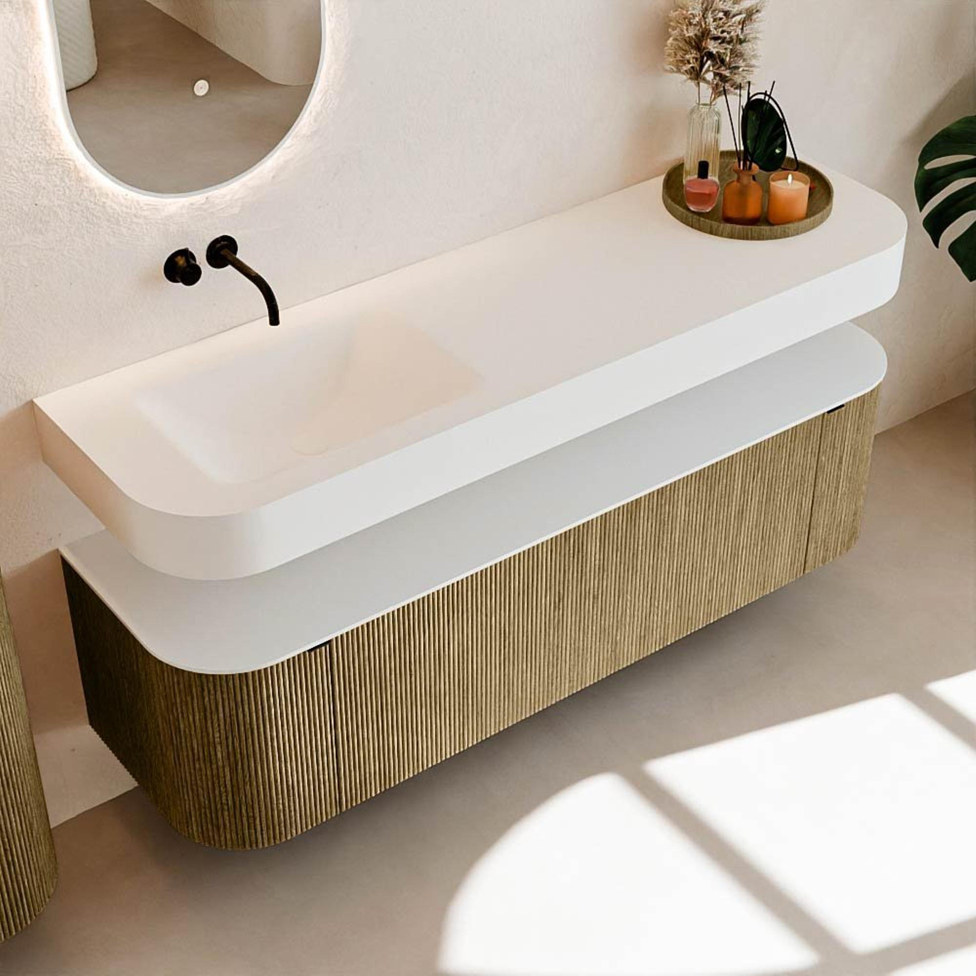 Boven het meubel zweeft een bijpassende, vrij hangende wastafel met afgeronde hoeken – perfect afgestemd op de vorm van de kast. De wastafel is uitgevoerd in Solid Surface en volgt subtiel de lijnen van het onderliggende meubel, waardoor een harmonieus geheel ontstaat. Het Solid Surface topblad vormt een sterke, onderhoudsvriendelijke basis en maakt de combinatie compleet.