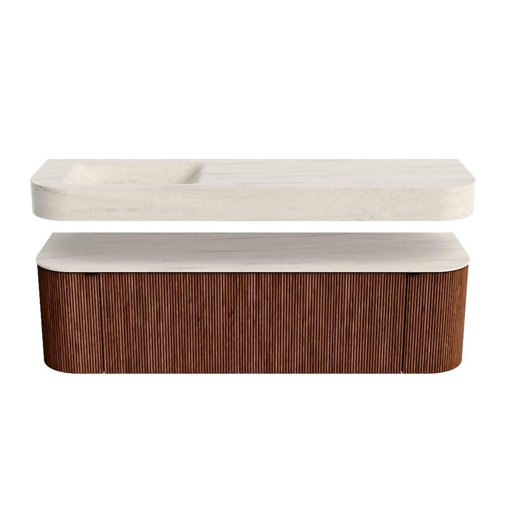 Boven het meubel zweeft een bijpassende, vrij hangende wastafel met afgeronde hoeken – perfect afgestemd op de vorm van de kast. De wastafel is uitgevoerd in Solid Surface en volgt subtiel de lijnen van het onderliggende meubel, waardoor een harmonieus geheel ontstaat. Het Solid Surface topblad vormt een sterke, onderhoudsvriendelijke basis en maakt de combinatie compleet.