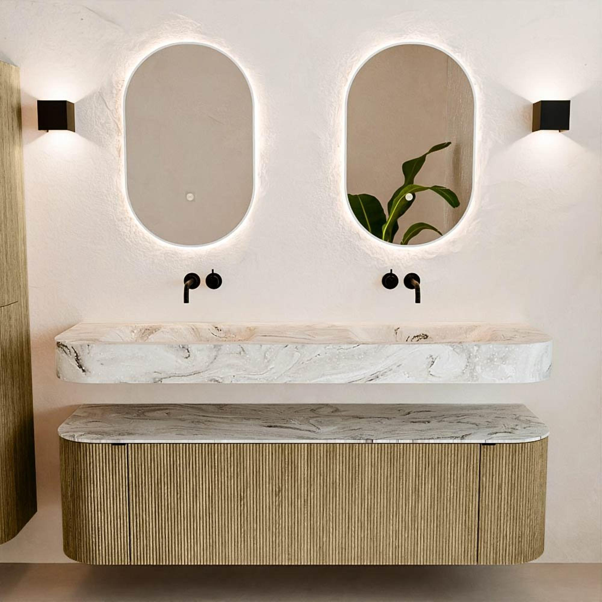 Natuurlijke materialen in warme tinten. De verticale ribbels brengen ritme en textuur in het ontwerp, terwijl het eikenhout zorgt voor een warme, ambachtelijke uitstraling. Kies uit 5 houttinten OAK, WALNUT, DUSK, SHADOW en RUBY zorgvuldig geselecteerde houtkleuren om zowel moderne als klassieke badkamers te verrijken.