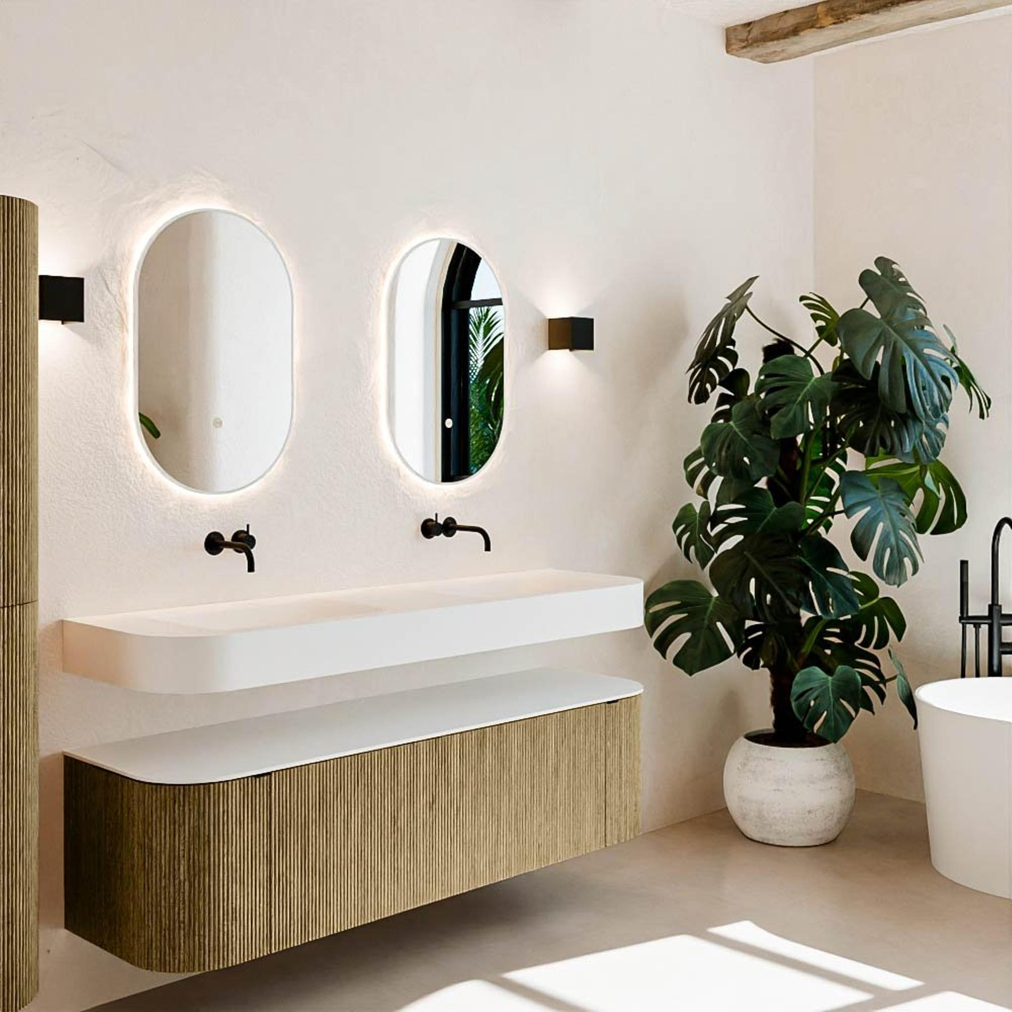 Natuurlijke materialen in warme tinten. De verticale ribbels brengen ritme en textuur in het ontwerp, terwijl het eikenhout zorgt voor een warme, ambachtelijke uitstraling. Kies uit 5 houttinten OAK, WALNUT, DUSK, SHADOW en RUBY zorgvuldig geselecteerde houtkleuren om zowel moderne als klassieke badkamers te verrijken.