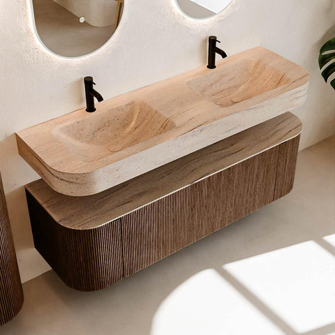 Natuurlijke materialen in warme tinten. De verticale ribbels brengen ritme en textuur in het ontwerp, terwijl het eikenhout zorgt voor een warme, ambachtelijke uitstraling. Kies uit 5 houttinten OAK, WALNUT, DUSK, SHADOW en RUBY zorgvuldig geselecteerde houtkleuren om zowel moderne als klassieke badkamers te verrijken.