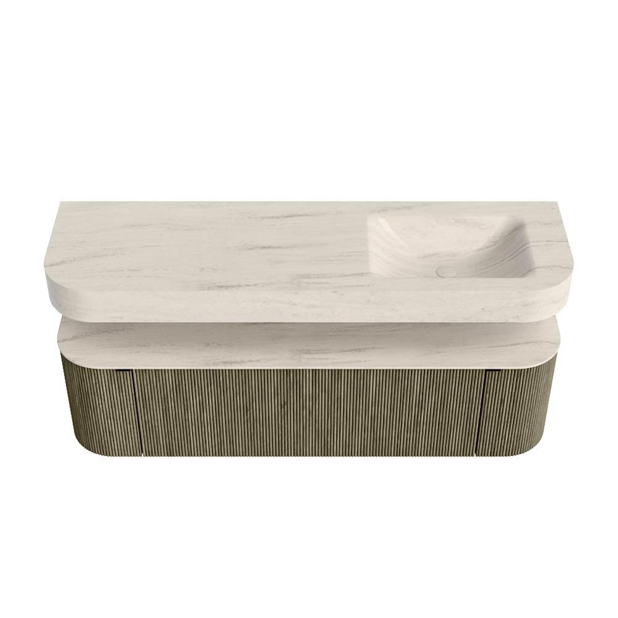 Boven het meubel zweeft een bijpassende, vrij hangende wastafel met afgeronde hoeken – perfect afgestemd op de vorm van de kast. De wastafel is uitgevoerd in Solid Surface en volgt subtiel de lijnen van het onderliggende meubel, waardoor een harmonieus geheel ontstaat. Het Solid Surface topblad vormt een sterke, onderhoudsvriendelijke basis en maakt de combinatie compleet.