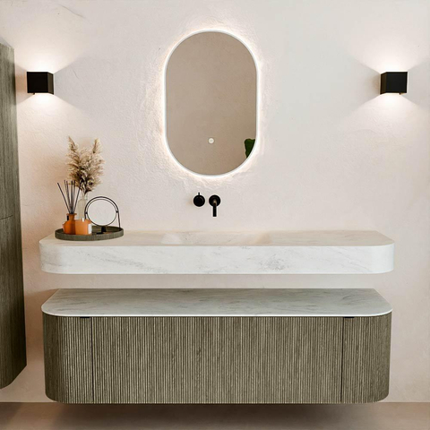 Boven het meubel zweeft een bijpassende, vrij hangende wastafel met afgeronde hoeken – perfect afgestemd op de vorm van de kast. De wastafel is uitgevoerd in Solid Surface en volgt subtiel de lijnen van het onderliggende meubel, waardoor een harmonieus geheel ontstaat. Het Solid Surface topblad vormt een sterke, onderhoudsvriendelijke basis en maakt de combinatie compleet.