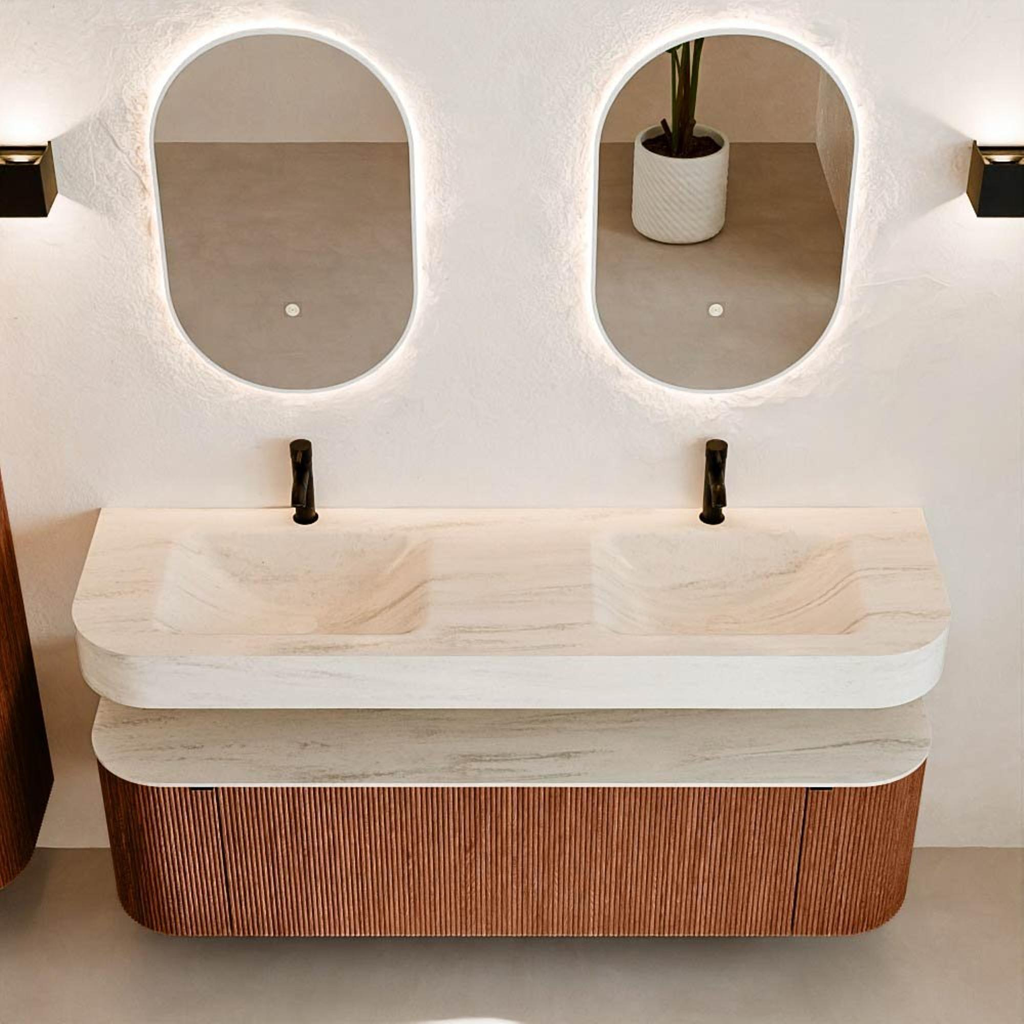 Natuurlijke materialen in warme tinten. De verticale ribbels brengen ritme en textuur in het ontwerp, terwijl het eikenhout zorgt voor een warme, ambachtelijke uitstraling. Kies uit 5 houttinten OAK, WALNUT, DUSK, SHADOW en RUBY zorgvuldig geselecteerde houtkleuren om zowel moderne als klassieke badkamers te verrijken.
