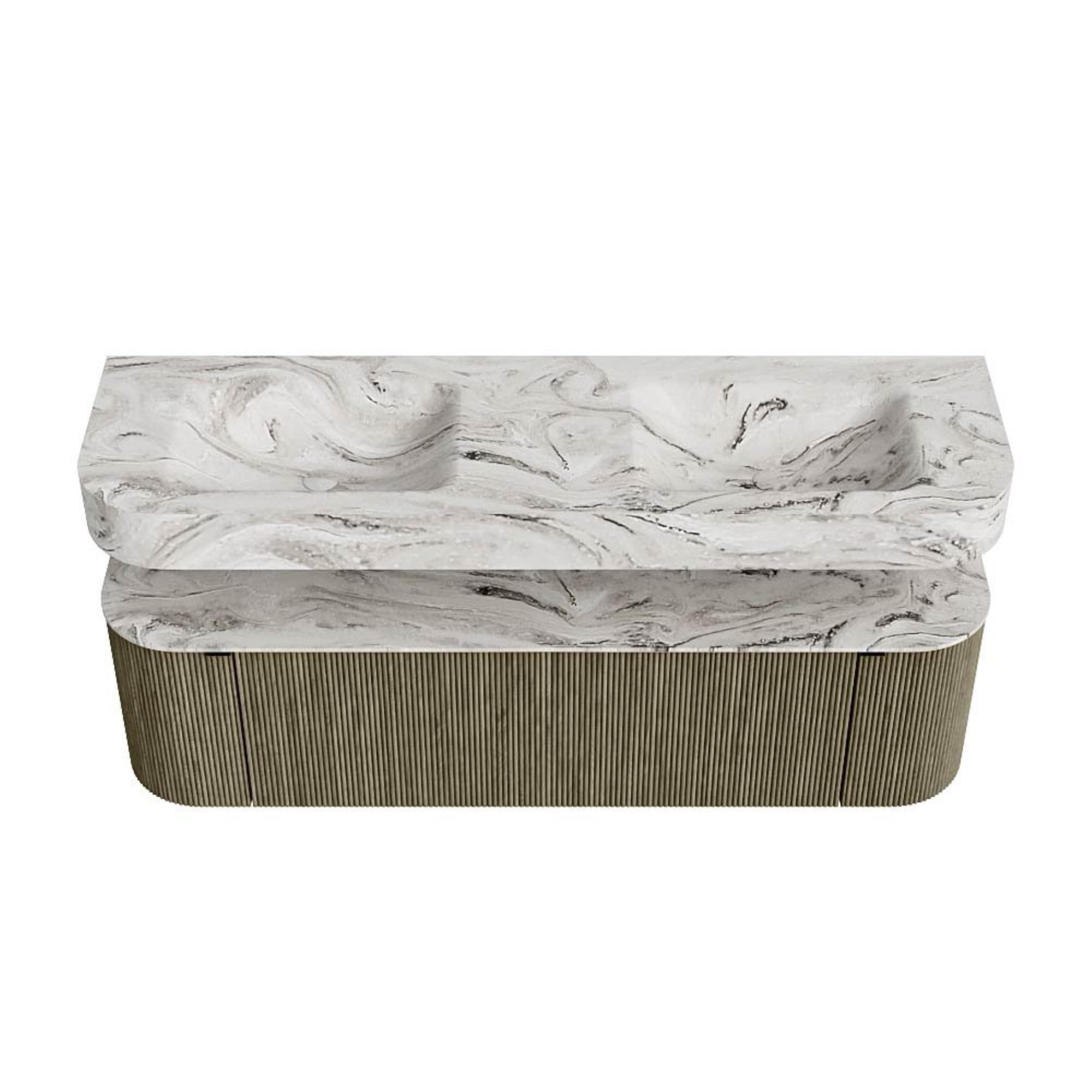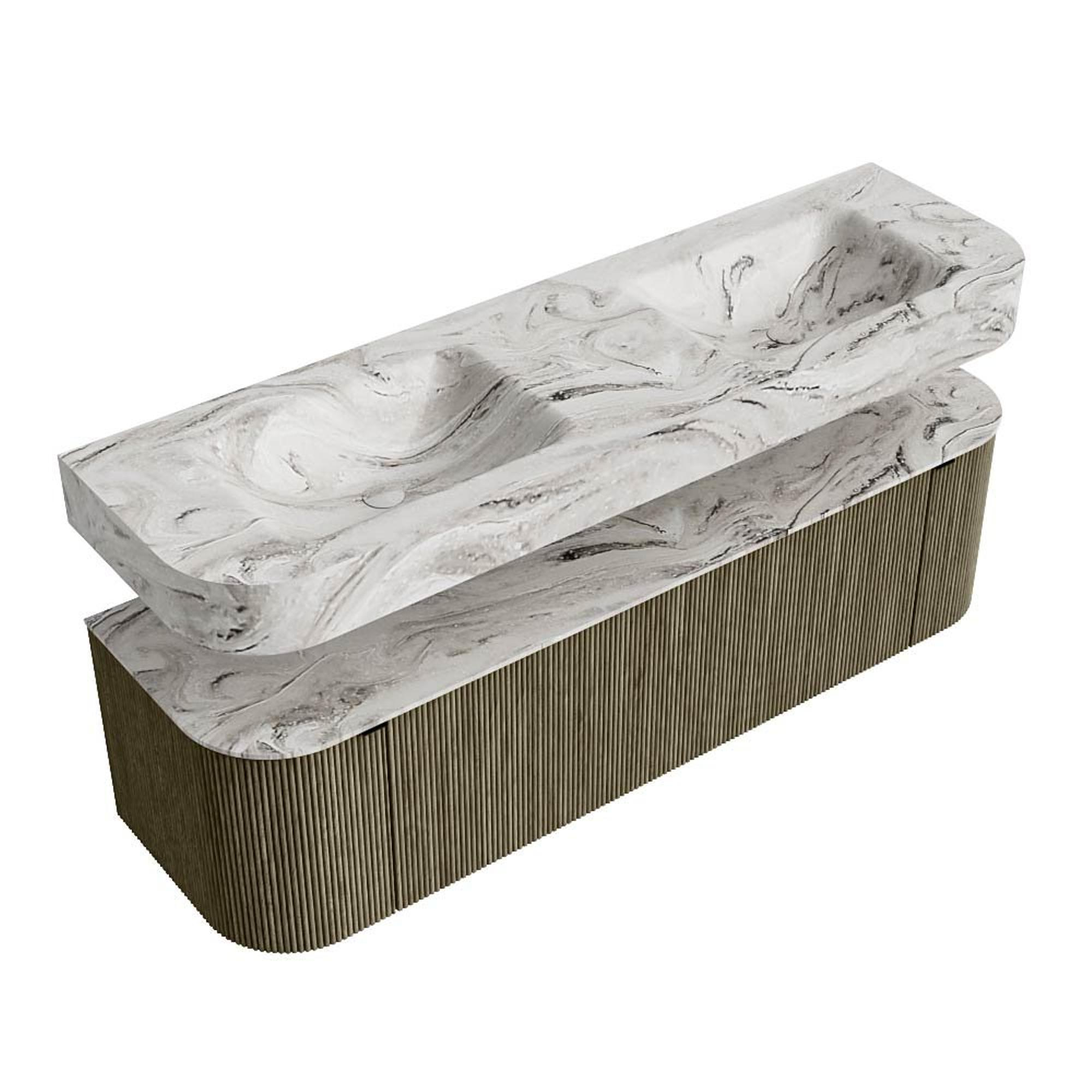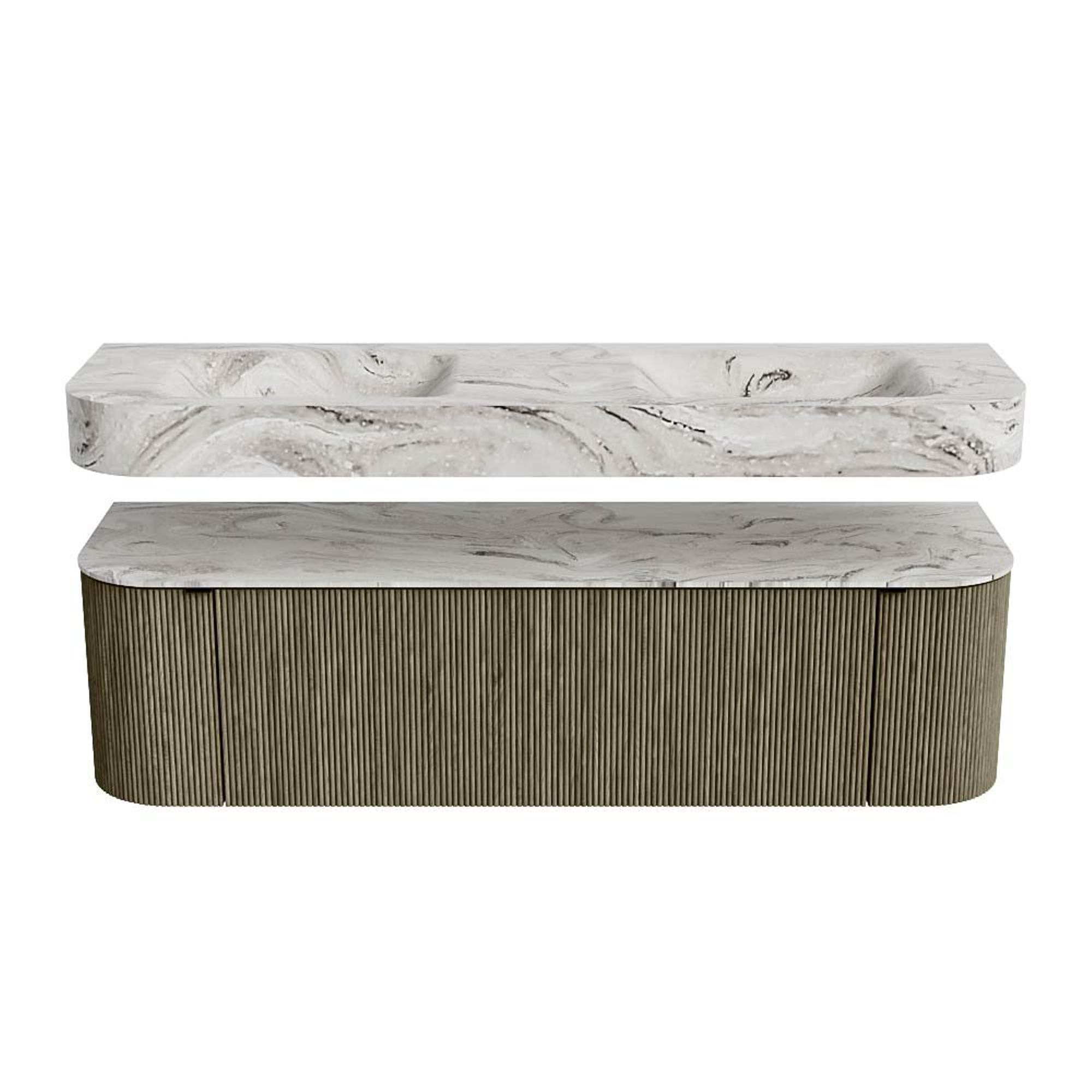MONDIAZ THOR-DLUX 160cm badmeubel ronding links + rechts kleur Shadow met 1 lade en 2 deuren. Vrijhangende wastafel CLOUD Dubbel 2 kraangaten kleur Glace.