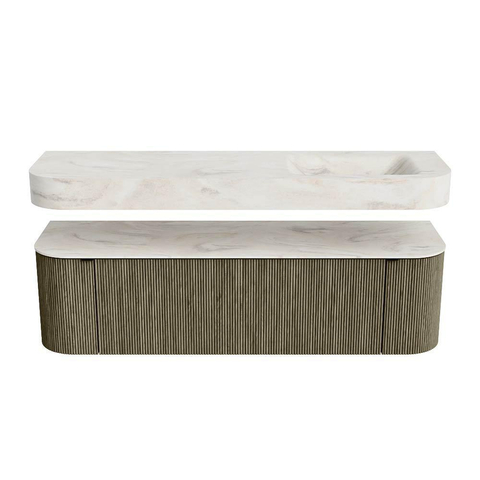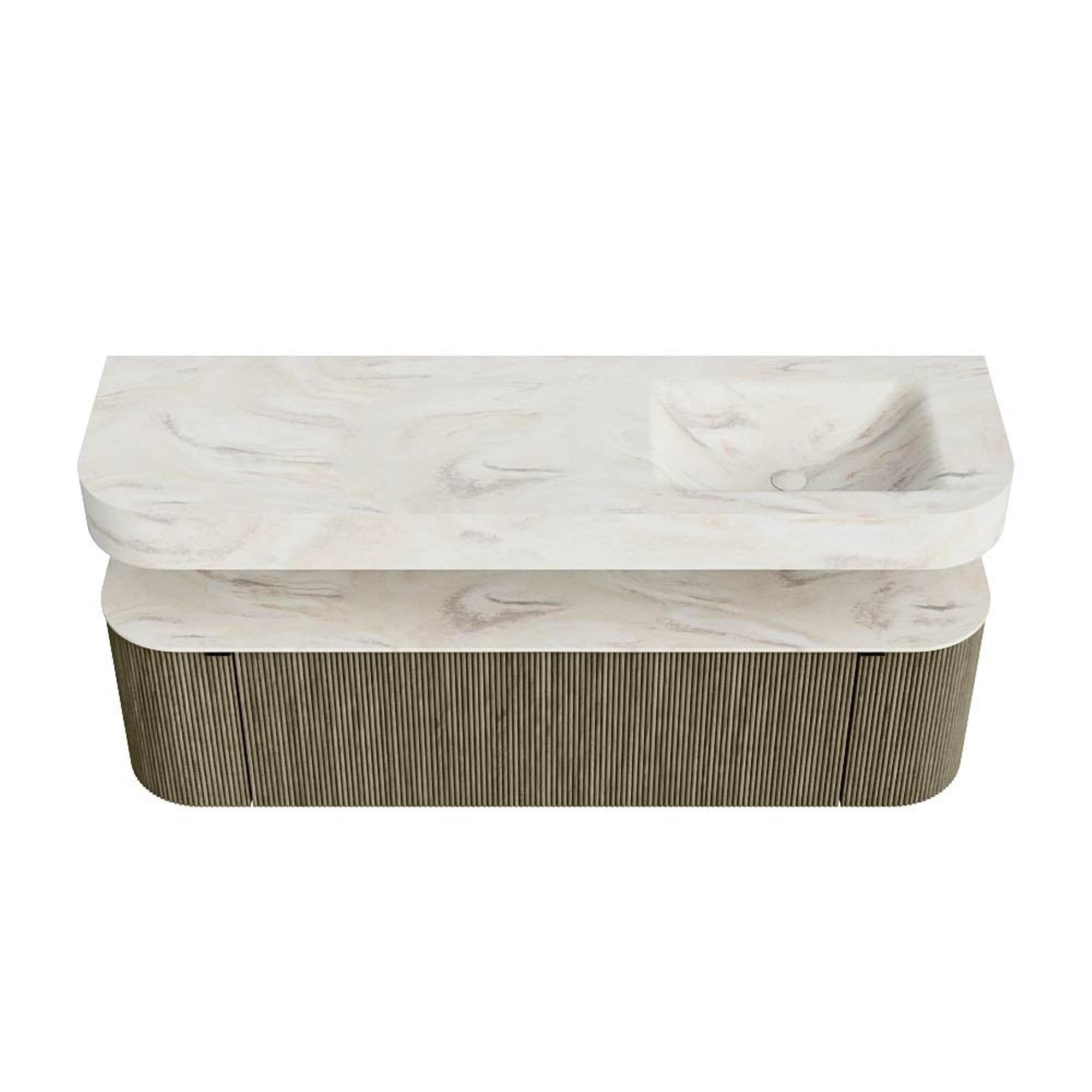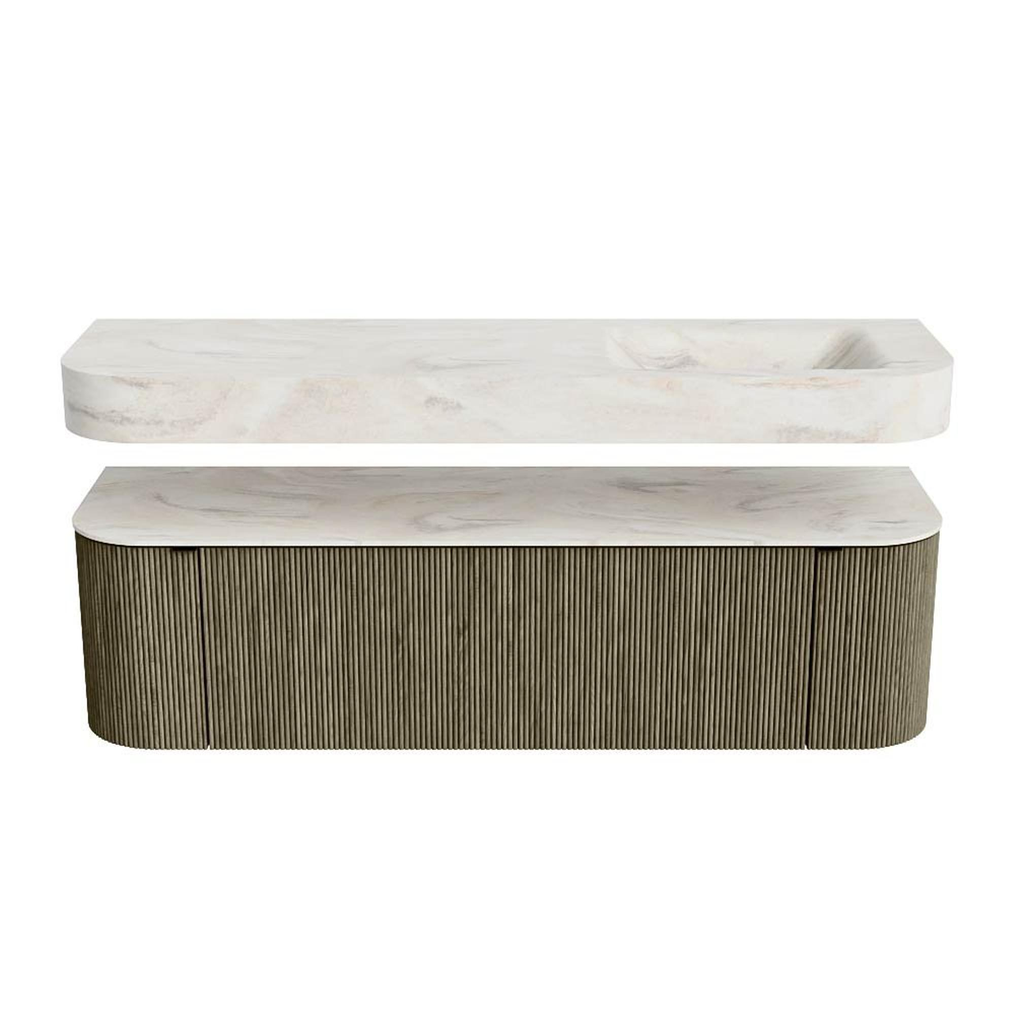 MONDIAZ THOR-DLUX 160cm badmeubel ronding links + rechts kleur Shadow met 1 lade en 2 deuren. Vrijhangende wastafel CLOUD Rechts zonder kraangat kleur Ostra.