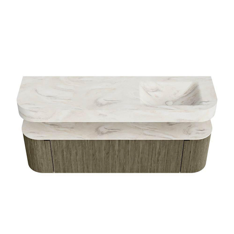 Boven het meubel zweeft een bijpassende, vrij hangende wastafel met afgeronde hoeken – perfect afgestemd op de vorm van de kast. De wastafel is uitgevoerd in Solid Surface en volgt subtiel de lijnen van het onderliggende meubel, waardoor een harmonieus geheel ontstaat. Het Solid Surface topblad vormt een sterke, onderhoudsvriendelijke basis en maakt de combinatie compleet.