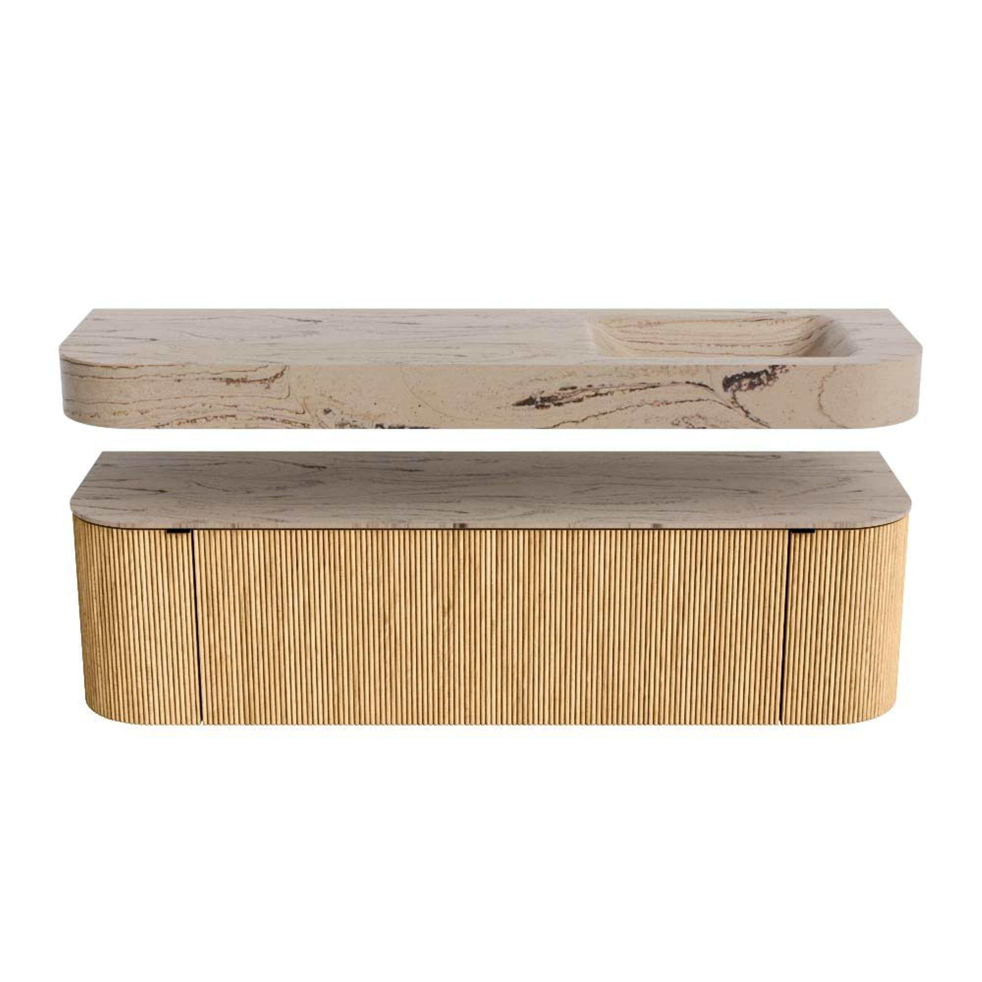 MONDIAZ THOR-DLUX 160cm badmeubel ronding links + rechts kleur Oak met 1 lade en 2 deuren. Vrijhangende wastafel CLOUD Rechts 1 kraangat kleur Arena.