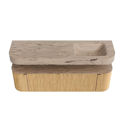 Boven het meubel zweeft een bijpassende, vrij hangende wastafel met afgeronde hoeken – perfect afgestemd op de vorm van de kast. De wastafel is uitgevoerd in Solid Surface en volgt subtiel de lijnen van het onderliggende meubel, waardoor een harmonieus geheel ontstaat. Het Solid Surface topblad vormt een sterke, onderhoudsvriendelijke basis en maakt de combinatie compleet.