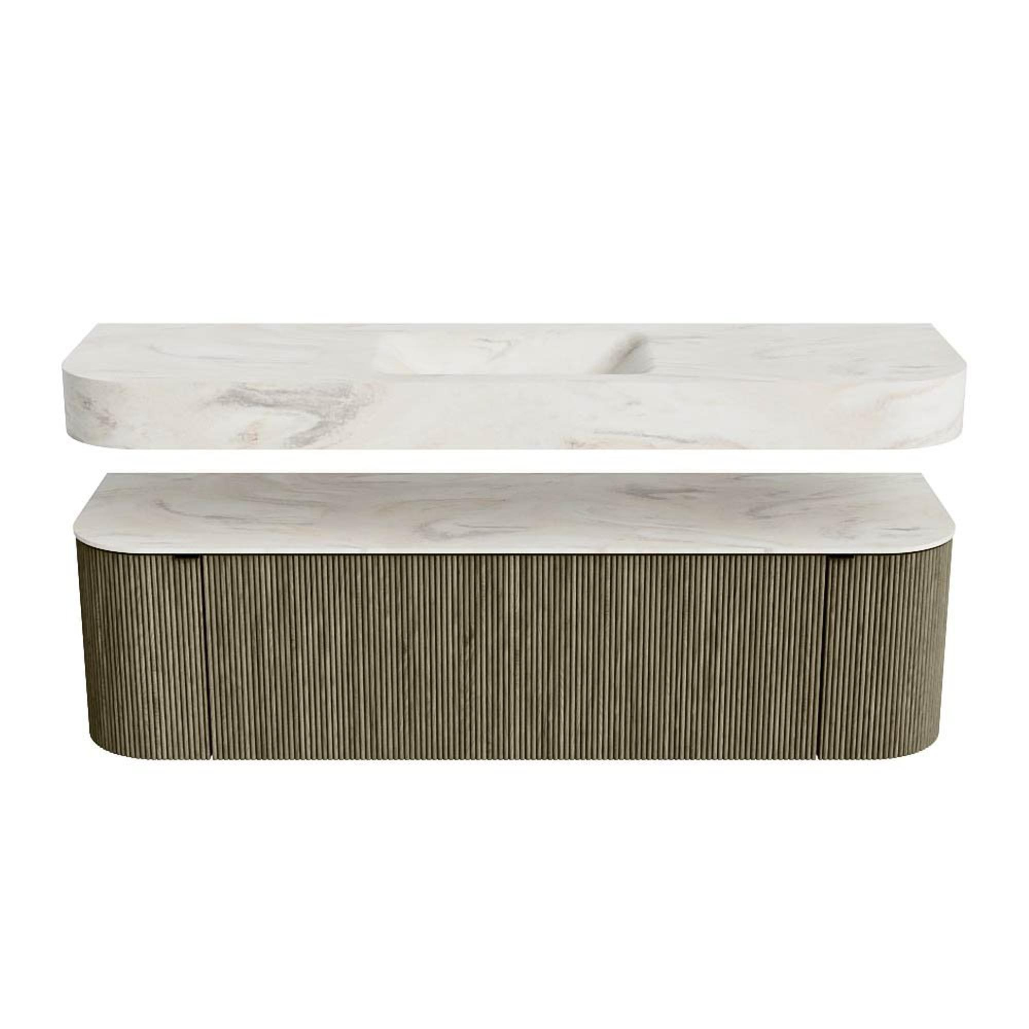 Boven het meubel zweeft een bijpassende, vrij hangende wastafel met afgeronde hoeken – perfect afgestemd op de vorm van de kast. De wastafel is uitgevoerd in Solid Surface en volgt subtiel de lijnen van het onderliggende meubel, waardoor een harmonieus geheel ontstaat. Het Solid Surface topblad vormt een sterke, onderhoudsvriendelijke basis en maakt de combinatie compleet.