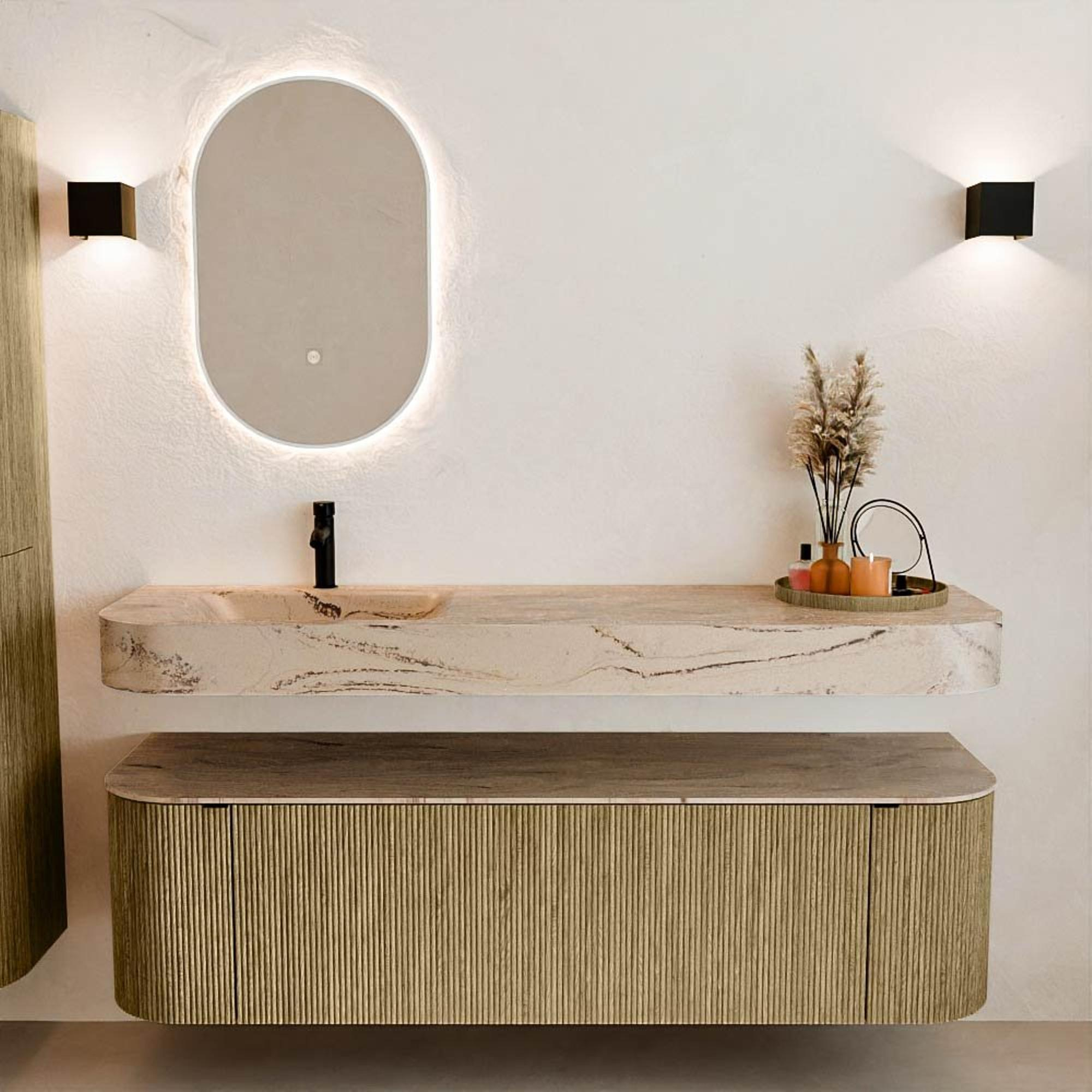 Natuurlijke materialen in warme tinten. De verticale ribbels brengen ritme en textuur in het ontwerp, terwijl het eikenhout zorgt voor een warme, ambachtelijke uitstraling. Kies uit 5 houttinten OAK, WALNUT, DUSK, SHADOW en RUBY zorgvuldig geselecteerde houtkleuren om zowel moderne als klassieke badkamers te verrijken.