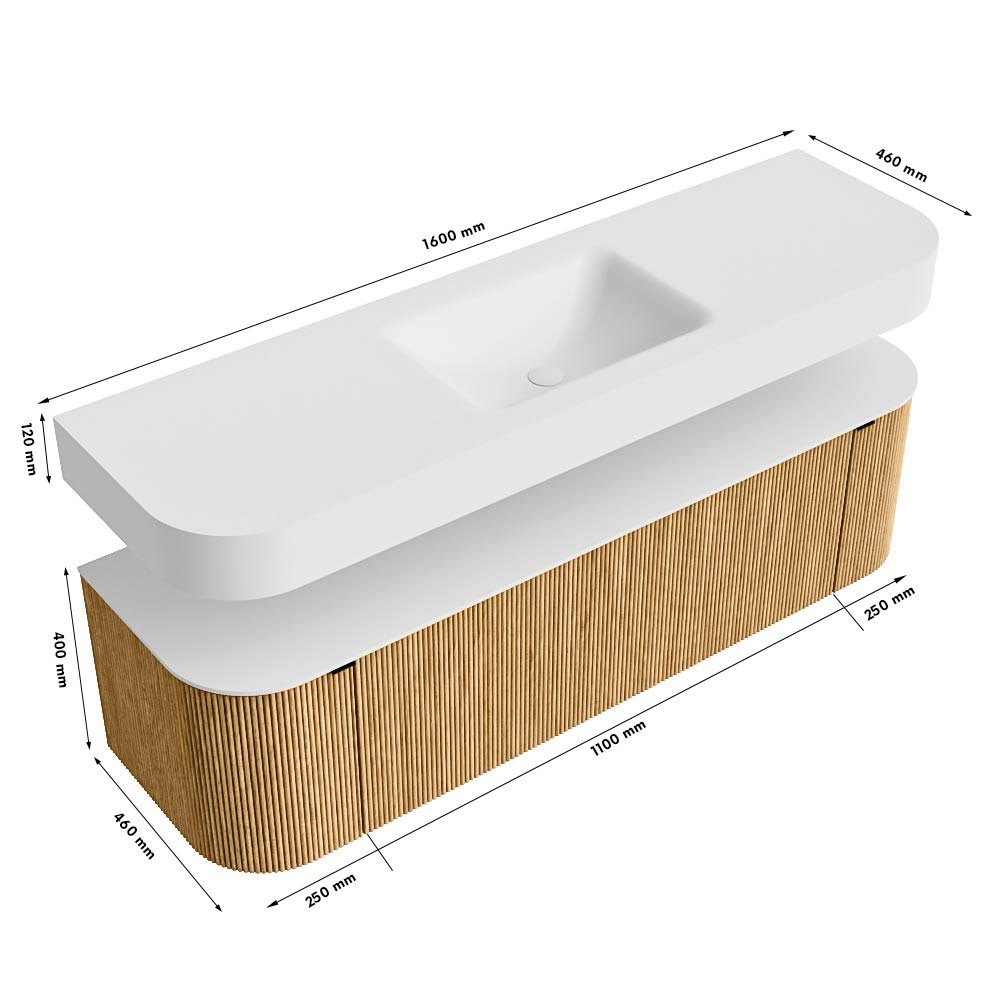 Boven het meubel zweeft een bijpassende, vrij hangende wastafel met afgeronde hoeken – perfect afgestemd op de vorm van de kast. De wastafel is uitgevoerd in Solid Surface en volgt subtiel de lijnen van het onderliggende meubel, waardoor een harmonieus geheel ontstaat. Het Solid Surface topblad vormt een sterke, onderhoudsvriendelijke basis en maakt de combinatie compleet.